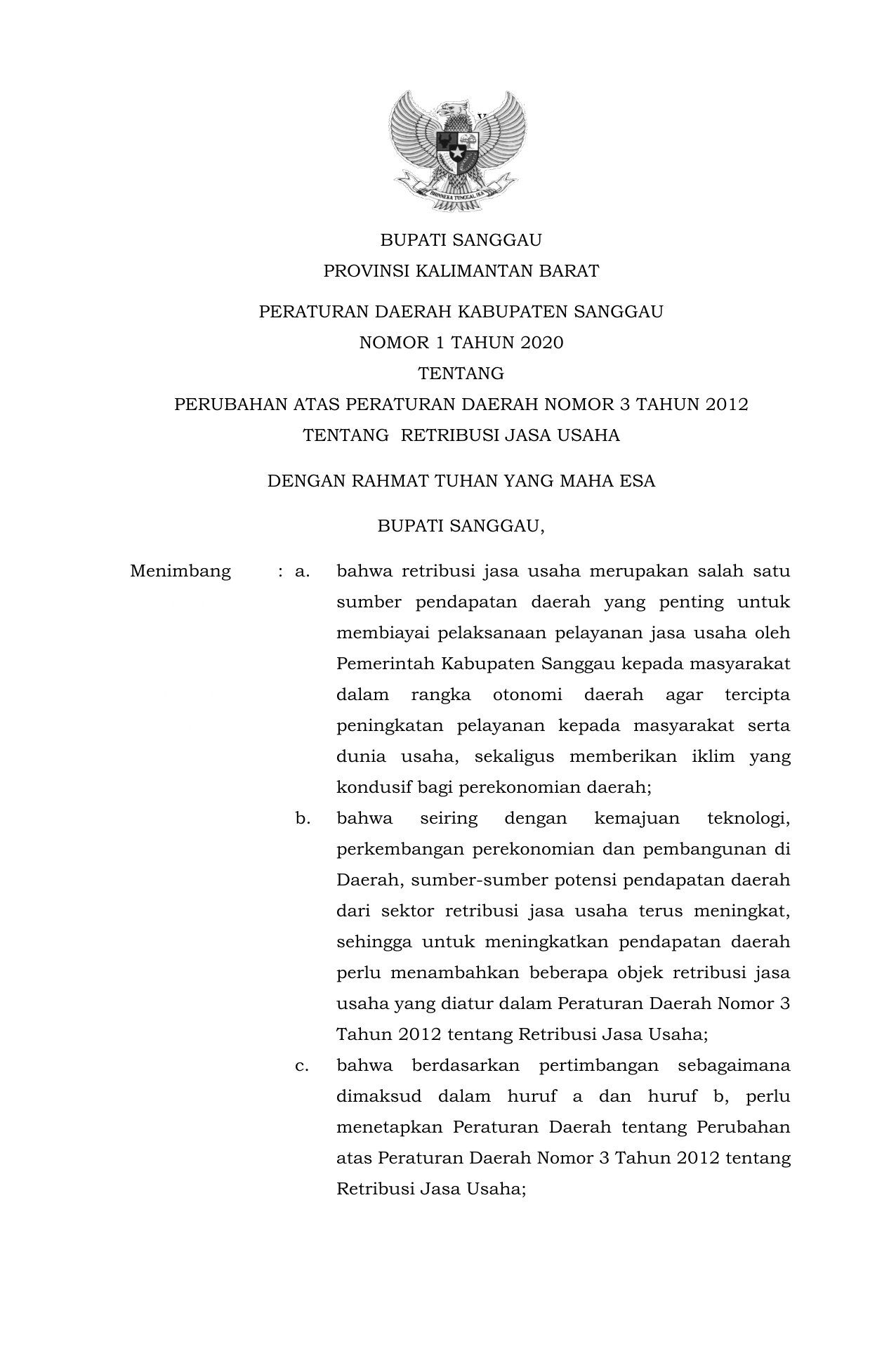 PERDA Nomor 1 Tahun 2020 | Peraturan Daerah Nomor 1 Tahun 2020 tentang PERUBAHAN ATAS PERATURAN DAERAH NOMOR 3 TAHUN 2012 TENTANG RETRIBUSI JASA USAHA