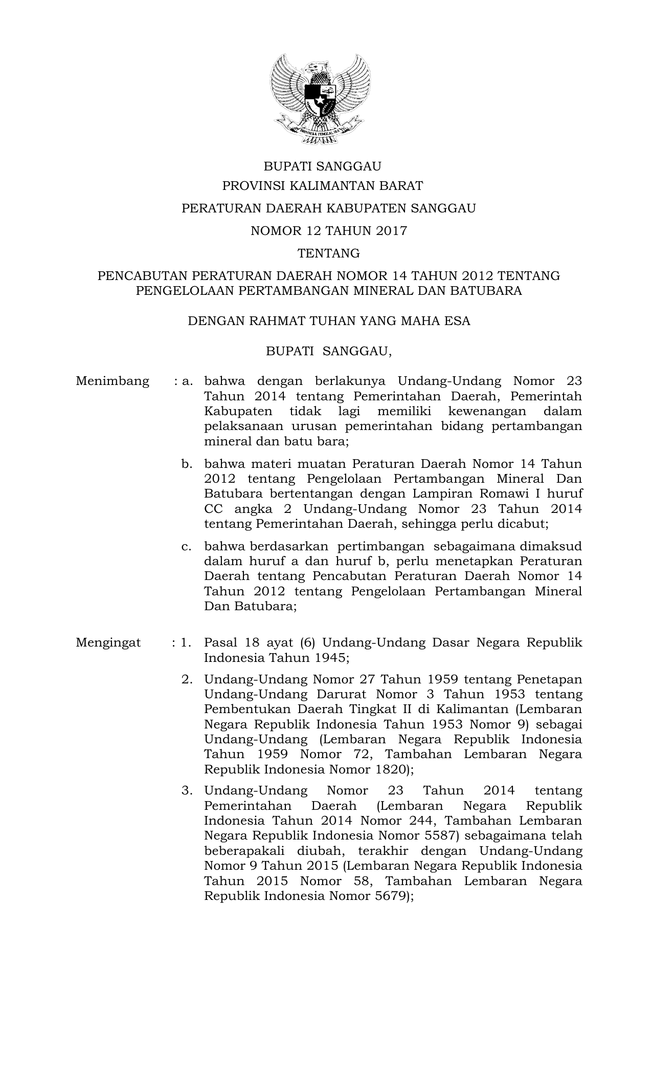 PERDA Nomor 12 Tahun 2017 | Peraturan Daerah Nomor 12 Tahun 2017 tentang PENCABUTAN PERATURAN DAERAH NOMOR 14 TAHUN 2012 TENTANG PENGELOLAAN PERTAMBANGAN MINERAL DAN BATUBARA