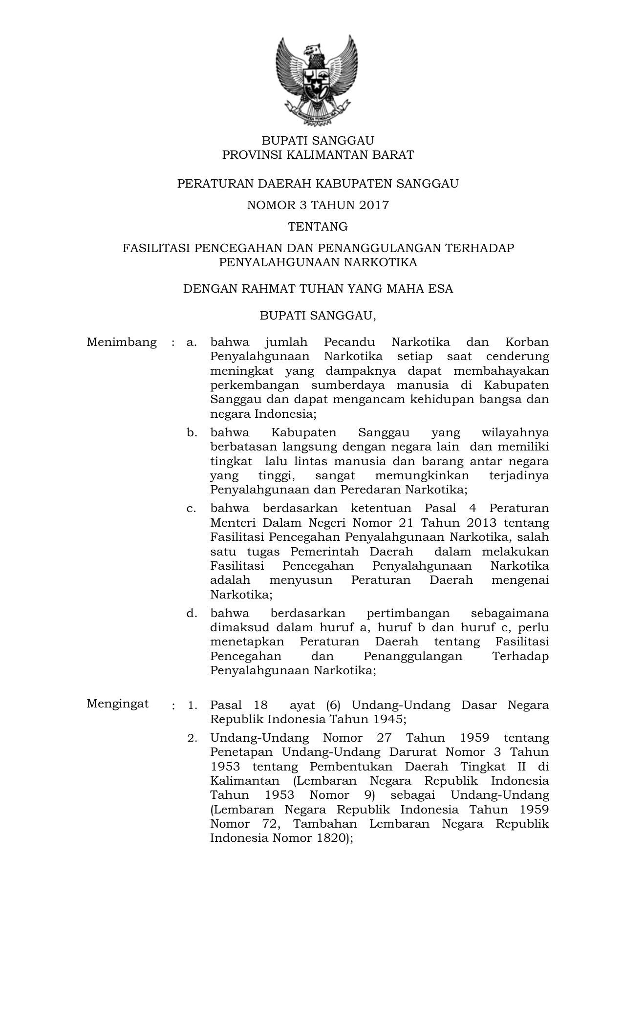PERDA Nomor 3 Tahun 2017 | Peraturan Daerah Nomor 3 Tahun 2017 tentang FASILITASI PENCEGAHAN DAN PENANGGULANGAN TERHADAP PENYALAHGUNAAN NARKOTIKA
