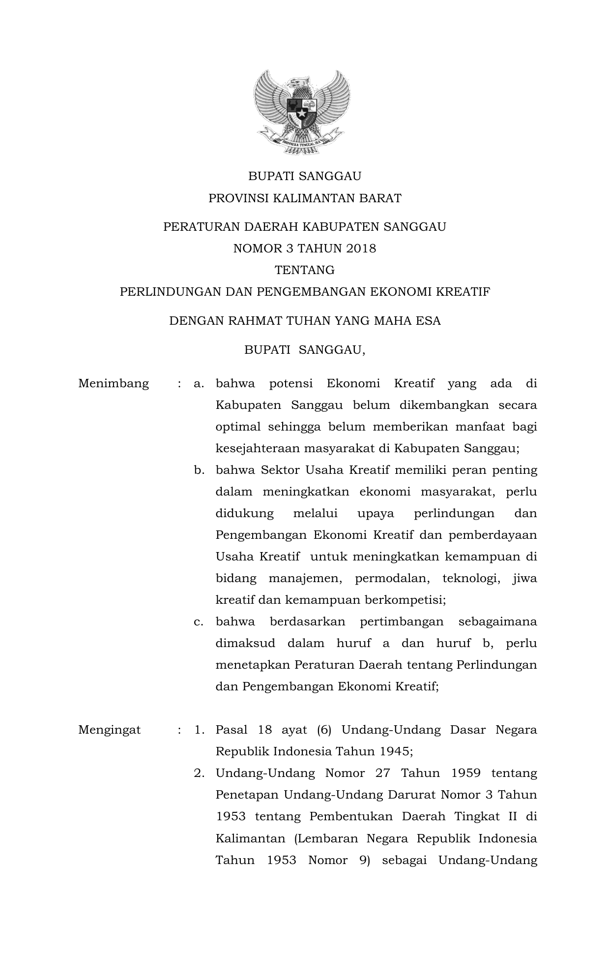 PERDA Nomor 3 Tahun 2018 | Peraturan Daerah Nomor 3 Tahun 2018 tentang PERLINDUNGAN DAN PENGEMBANGAN EKONOMI KREATIF DENGAN RAHMAT TUHAN YANG MAHA ESA