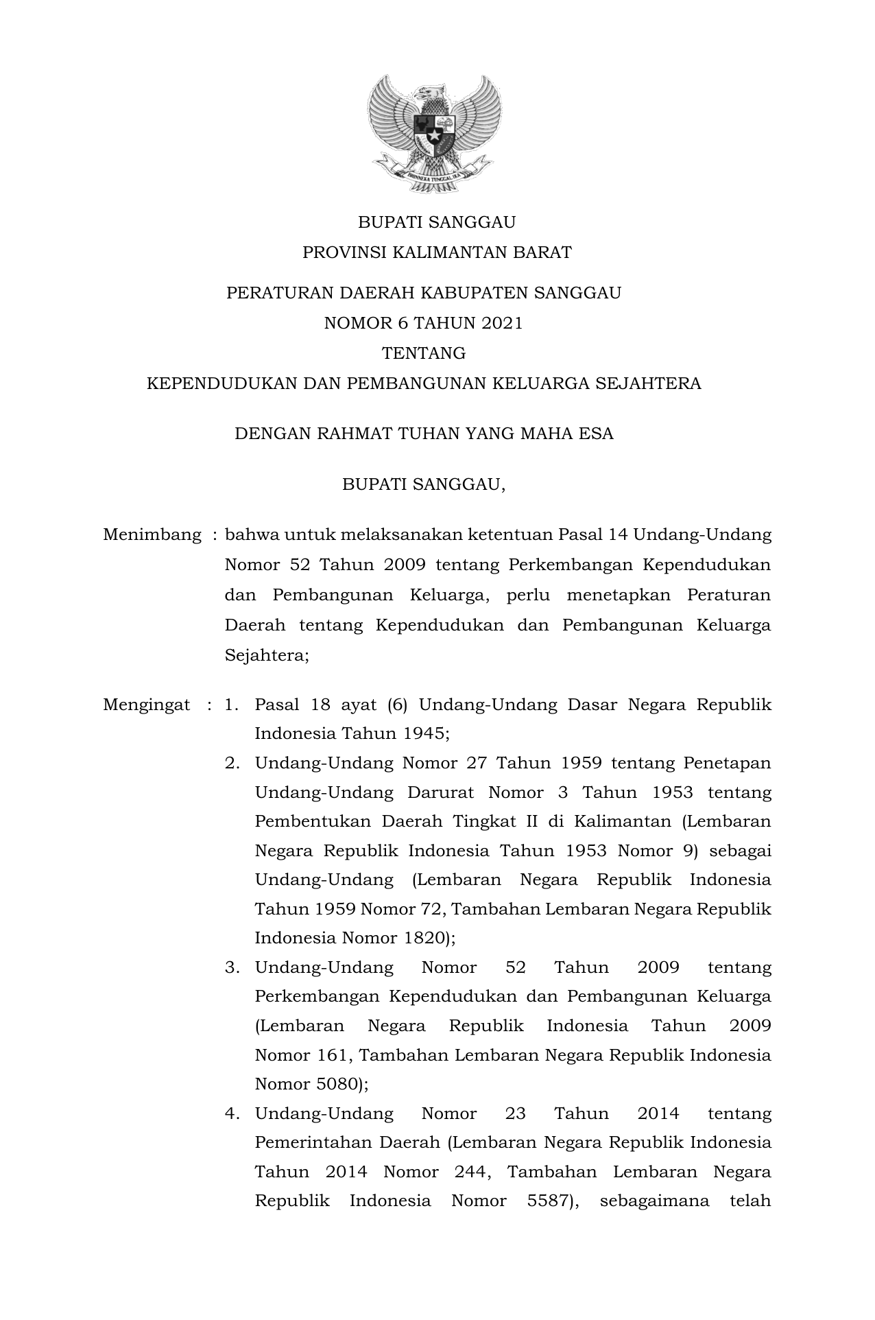 PERDA Nomor 6 Tahun 2021 | Peraturan Daerah Nomor 6 Tahun 2021 tentang KEPENDUDUKAN DAN PEMBANGUNAN KELUARGA SEJAHTERA