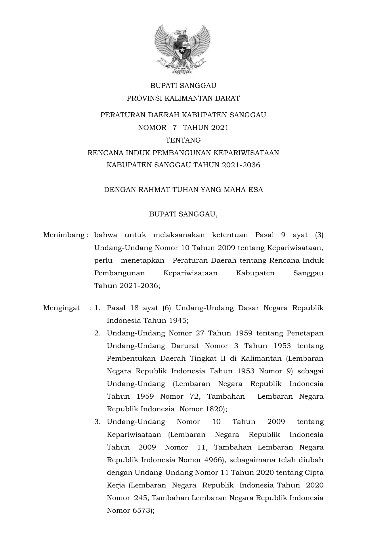 PERDA Nomor 7 Tahun 2021 | Peraturan Daerah Nomor 7 Tahun 2021 tentang RENCANA INDUK PEMBANGUNAN KEPARIWISATAAN KABUPATEN SANGGAU TAHUN 2021-2036