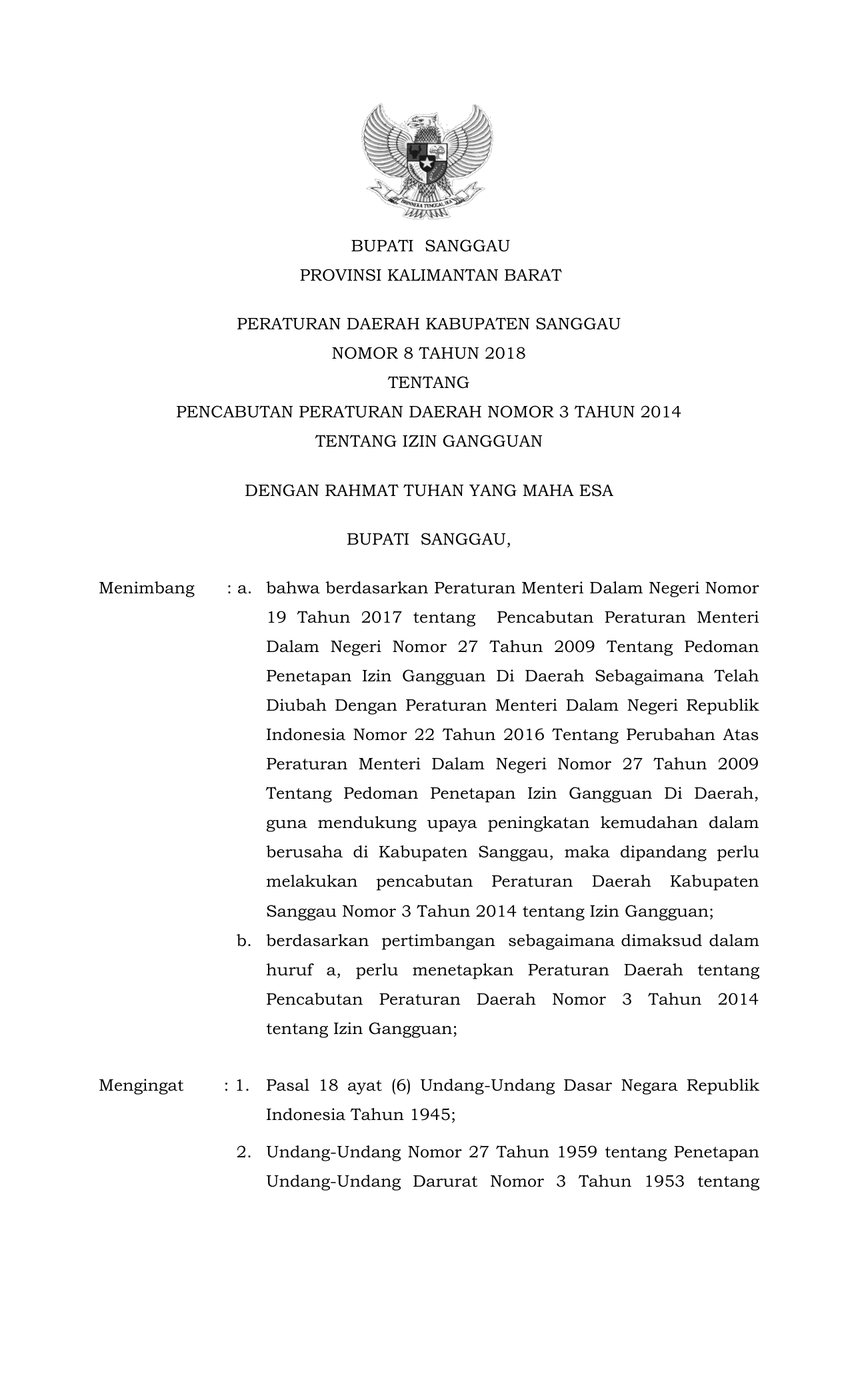 PERDA Nomor 8 Tahun 2018 | Peraturan Daerah Nomor 8 Tahun 2018 tentang PENCABUTAN PERATURAN DAERAH NOMOR 3 TAHUN 2014 TENTANG IZIN GANGGUAN