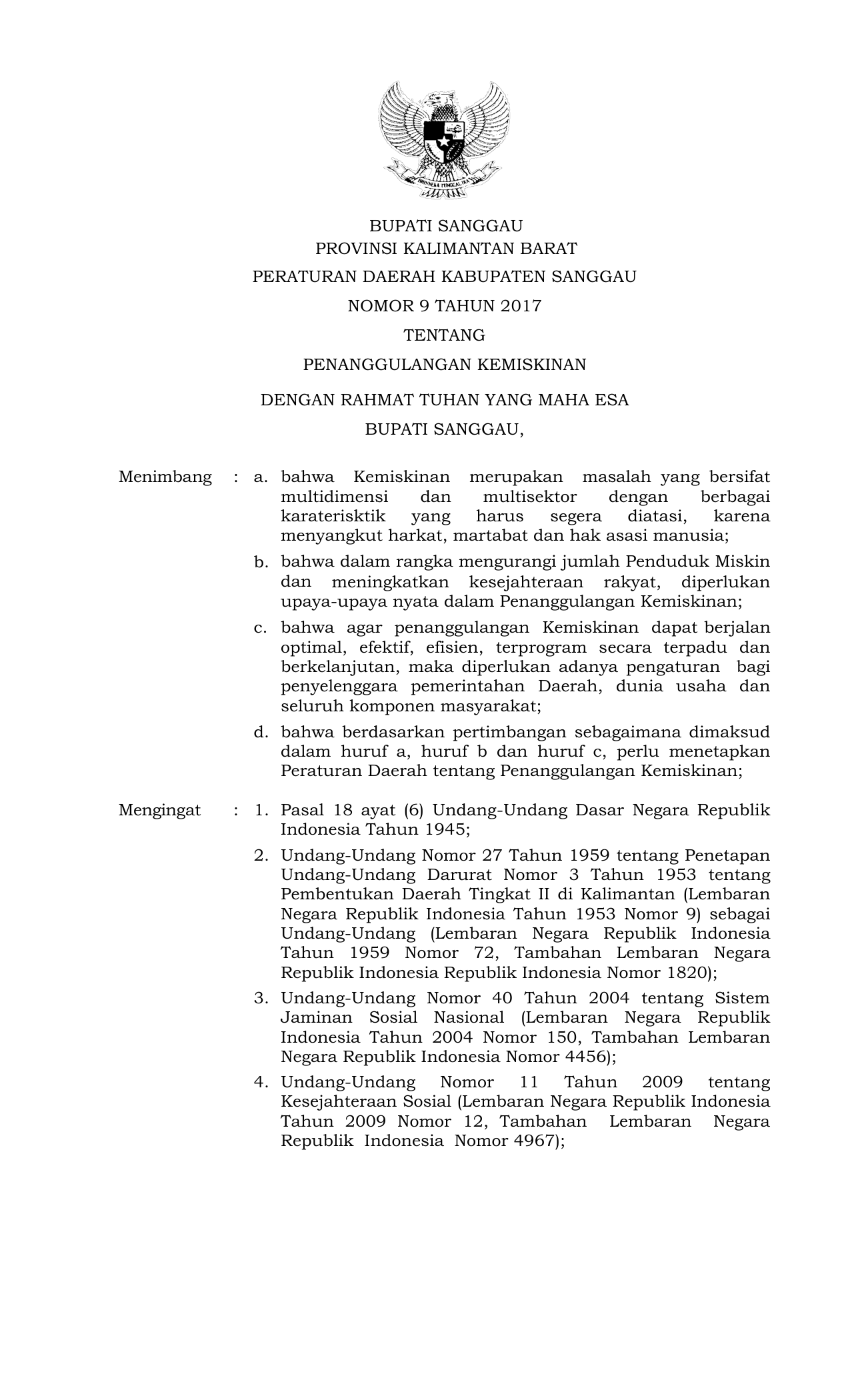 PERDA Nomor 9 Tahun 2017 | Peraturan Daerah Nomor 9 Tahun 2017 tentang PENANGGULANGAN KEMISKINAN