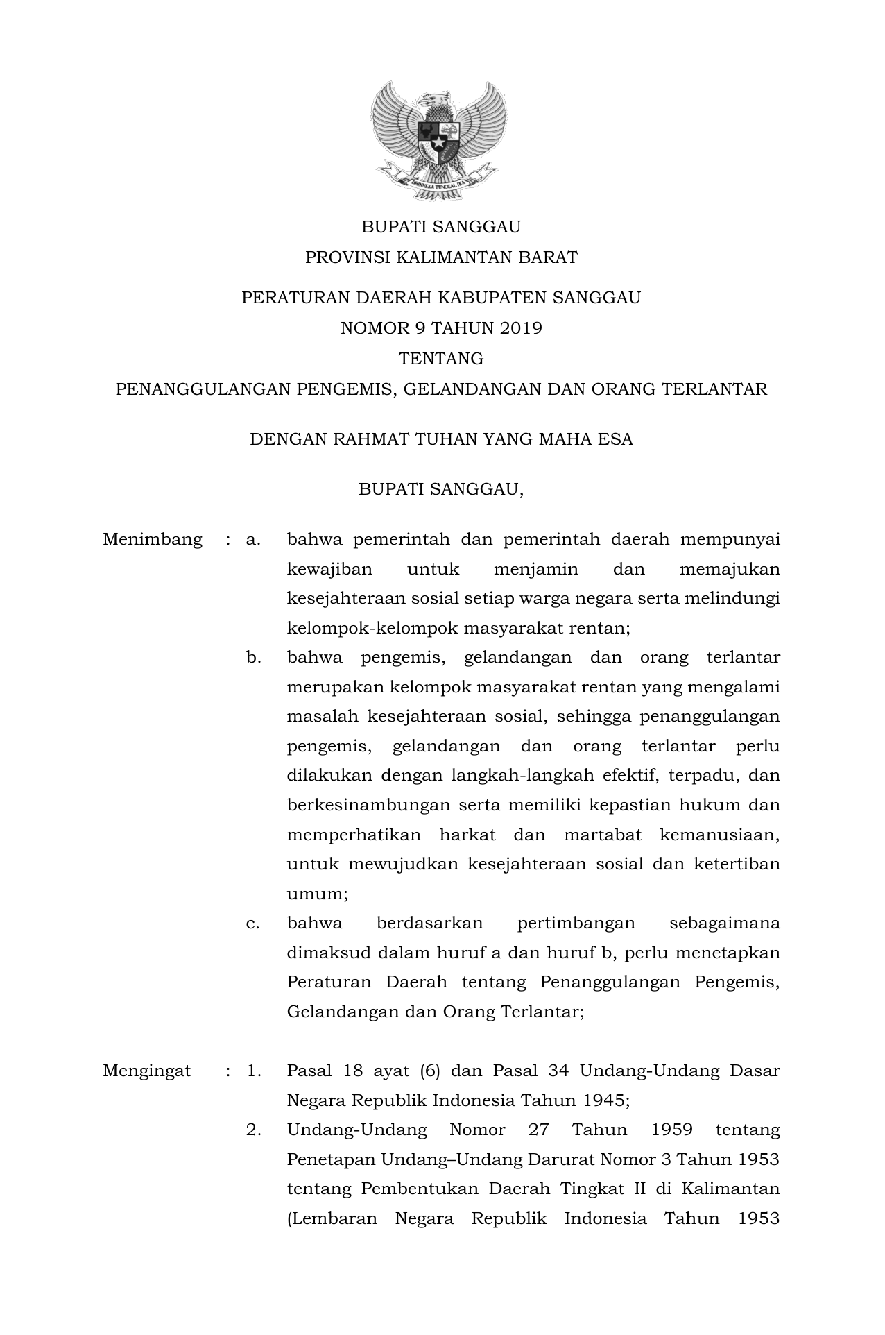 PERDA Nomor 9 Tahun 2019 | Peraturan Daerah Nomor 9 Tahun 2019 tentang PENANGGULANGAN PENGEMIS, GELANDANGAN DAN ORANG TERLANTAR
