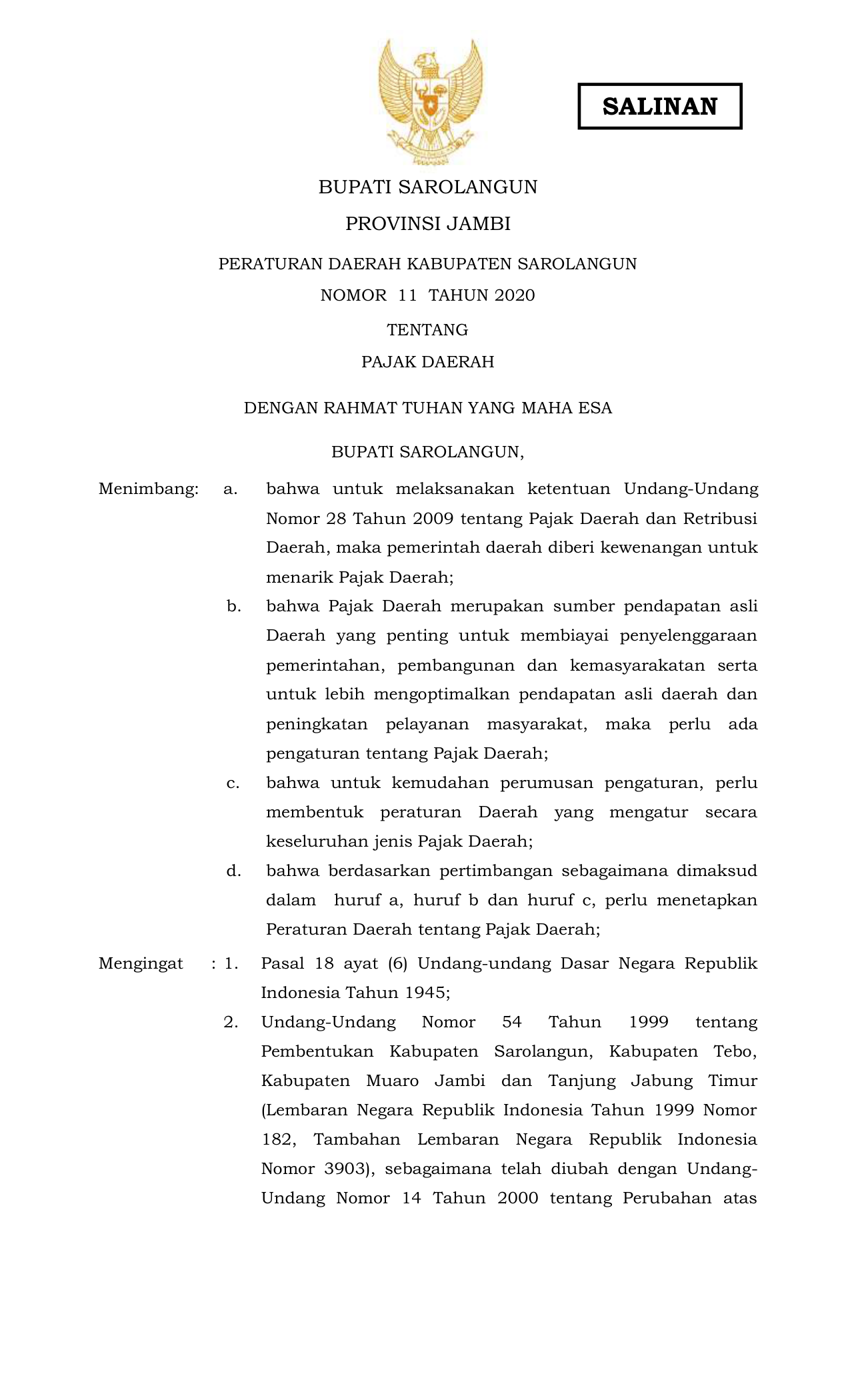 PERDA Nomor 11 Tahun 2020 | Peraturan Daerah Nomor 11 Tahun 2020 tentang PERATURAN DAERAH KABUPATEN SAROLANGUN NOMOR 11 TAHUN 2020 TENTANG PAJAK DAERAH