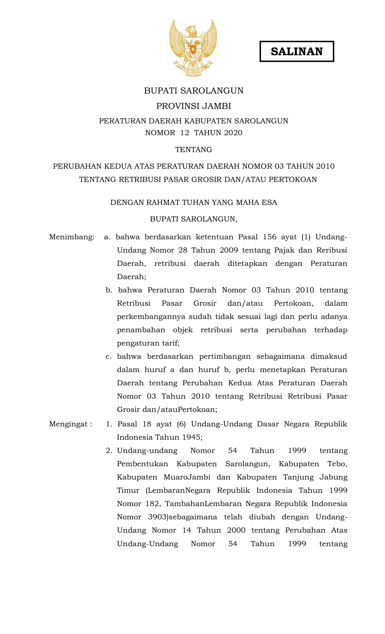 PERDA Nomor 12 Tahun 2020 | Peraturan Daerah Nomor 12 Tahun 2020 tentang PERATURAN DAERAH KABUPATEN SAROLANGUN NOMOR 12 TAHUN 2020 TENTANG RETRIBUSI PASAR GROSIR DAN/ATAUPERTOKOAN