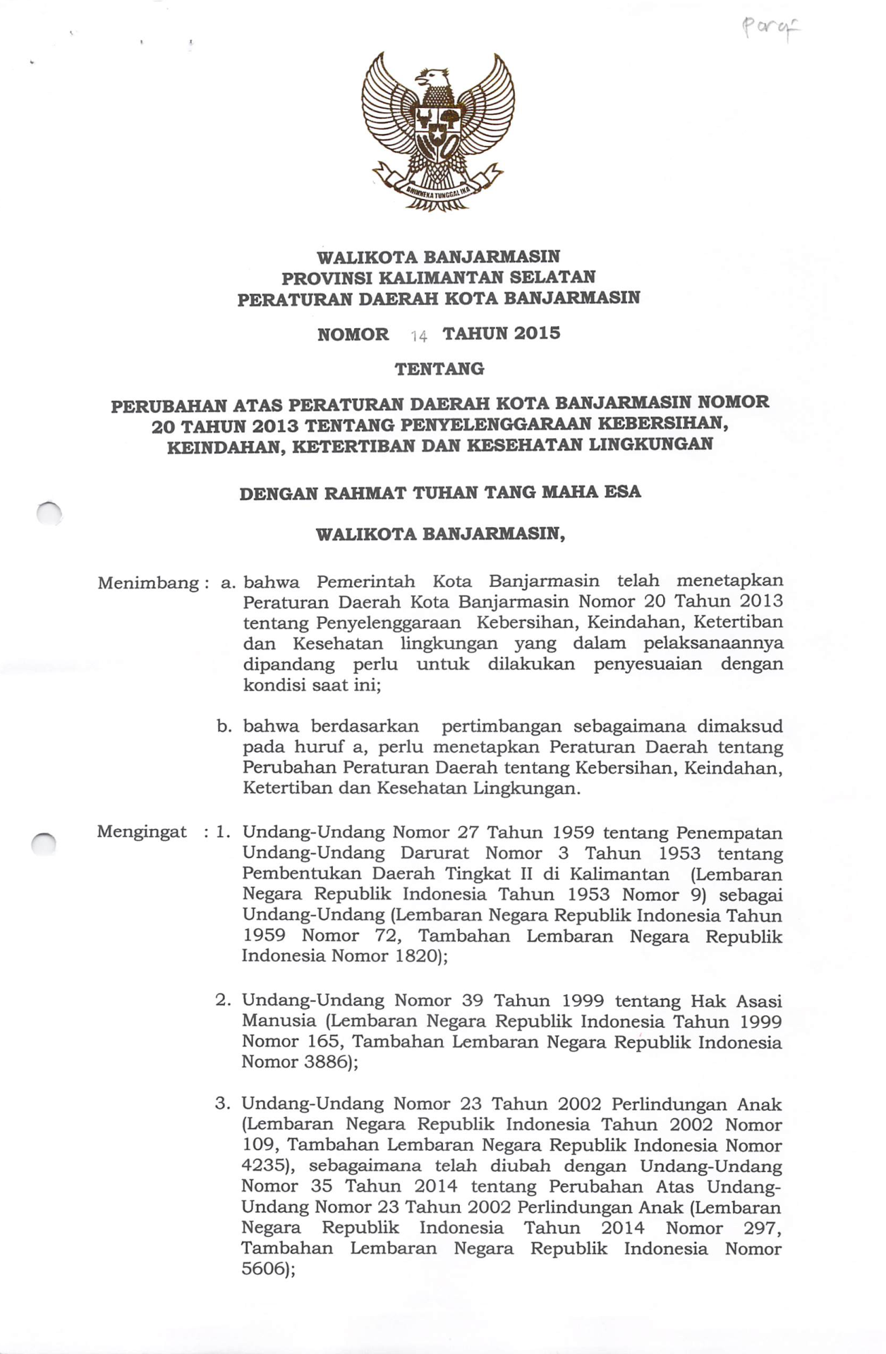 14. Desomber 2015 PJ. WALIKOTA BANJARMASIN ^-€%MAAr # MUHAMMAD THAMRIN Diundangkan di Banjarmasin pada tanggal, 15 Desomber 2015 ~ #LT- SEKRETARIS DAERAH KOTA BANJARMASIN, £ H. AGUS SURONO LEMBARAN DAERAH KOTA BANJARMASIN TAHUN 2015 NOMOR ...14 NOREG PERATURAN DAERAH KOTA BANJARMASIN, PROVINSI KALIMANTAN SELATAN : (20/2016)