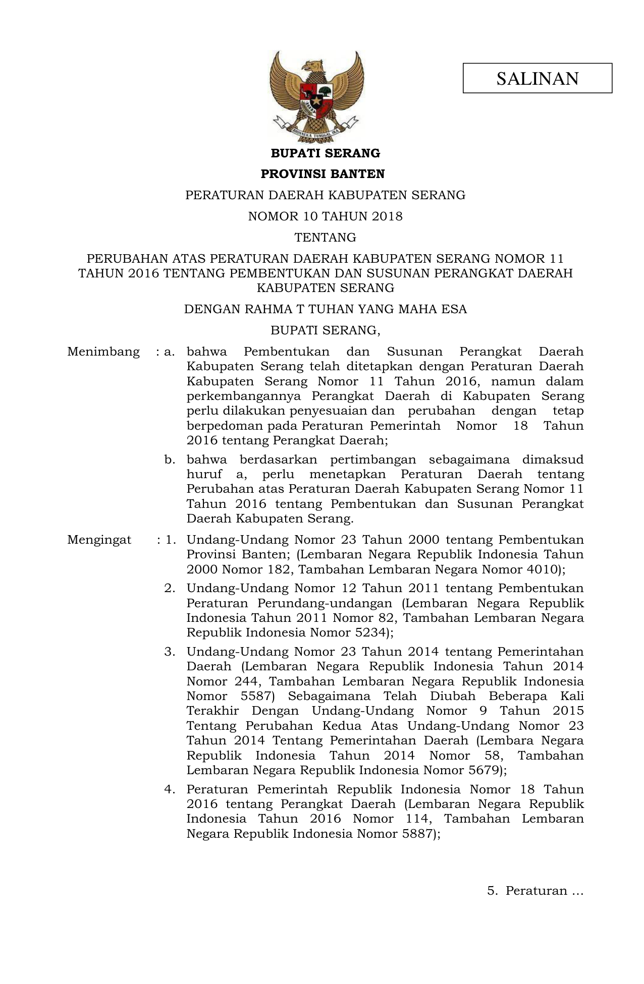 PERDA Nomor 10 Tahun 2018 | Peraturan Daerah Nomor 10 Tahun 2018 tentang PEMBENTUKAN DAN SUSUNAN PERANGKAT DAERAH KABUPATEN SERANG