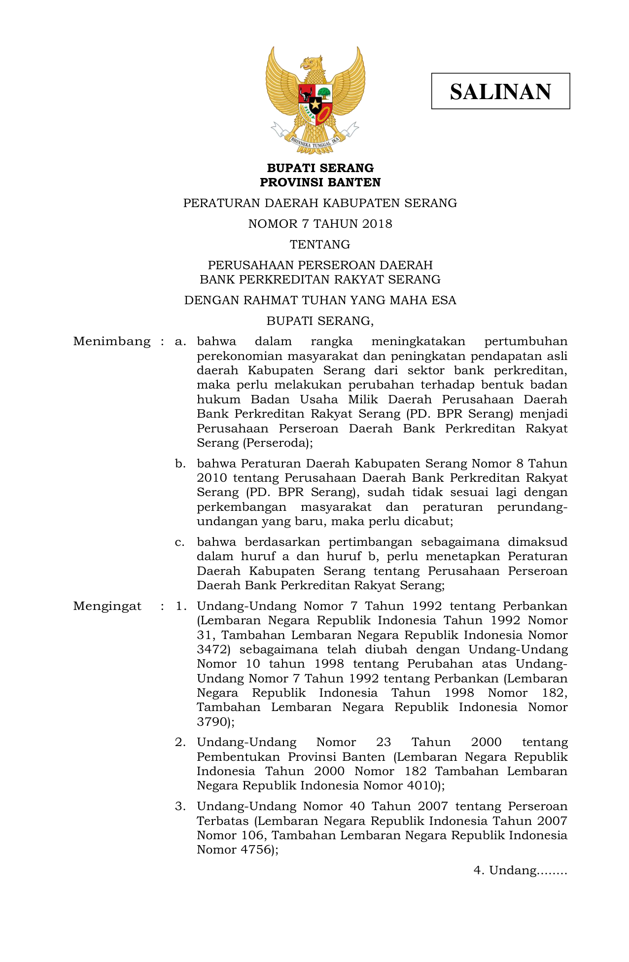 PERDA Nomor 7 Tahun 2018 | Peraturan Daerah Nomor 7 Tahun 2018 tentang PERUSAHAAN PERSEROAN DAERAH BANK PERKREDITAN RAKYAT SERANG