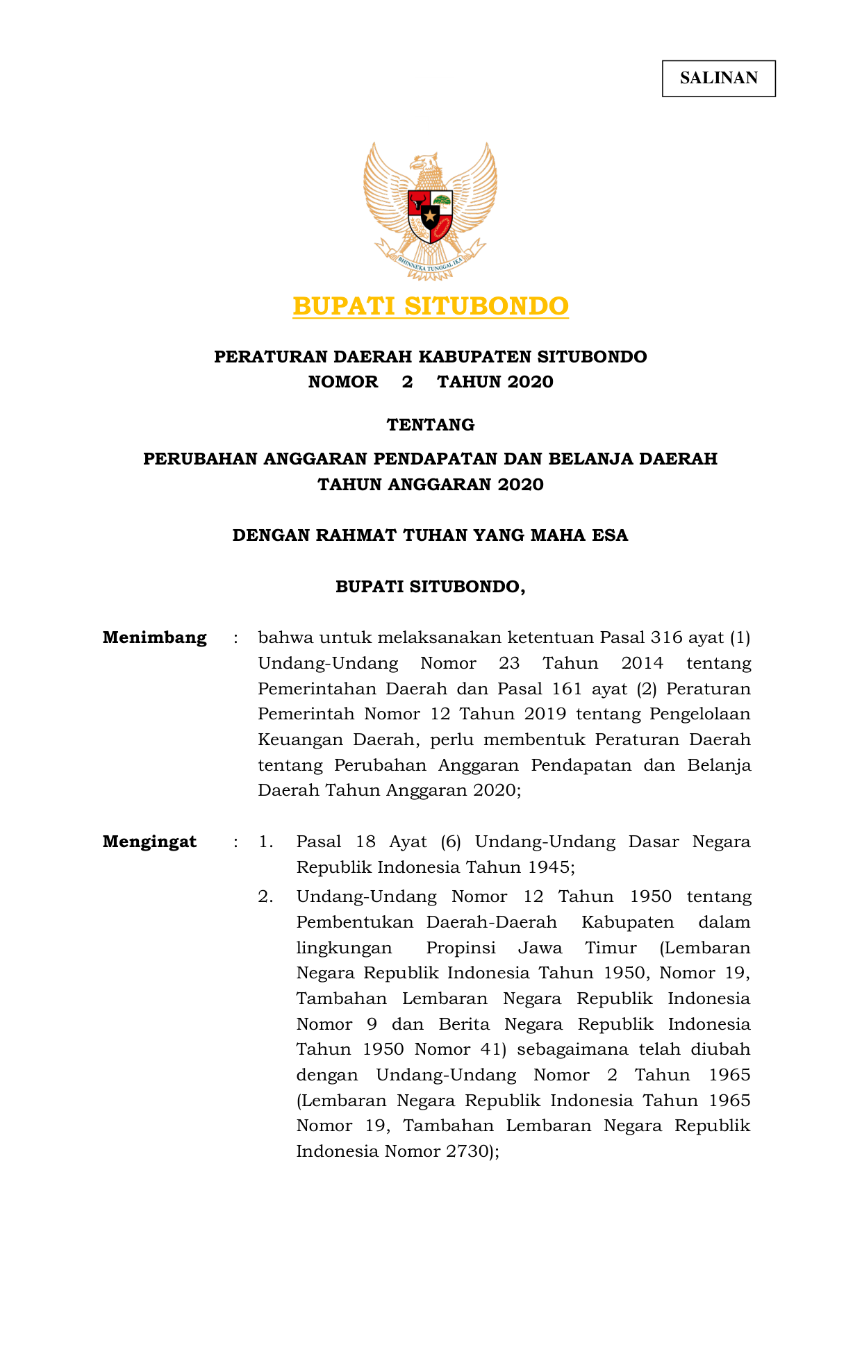 PERDA Nomor 2 Tahun 2020 | Peraturan Daerah Nomor 2 Tahun 2020 tentang PERUBAHAN ANGGARAN PENDAPATAN DAN BELANJA DAERAH TAHUN ANGGARAN 2020