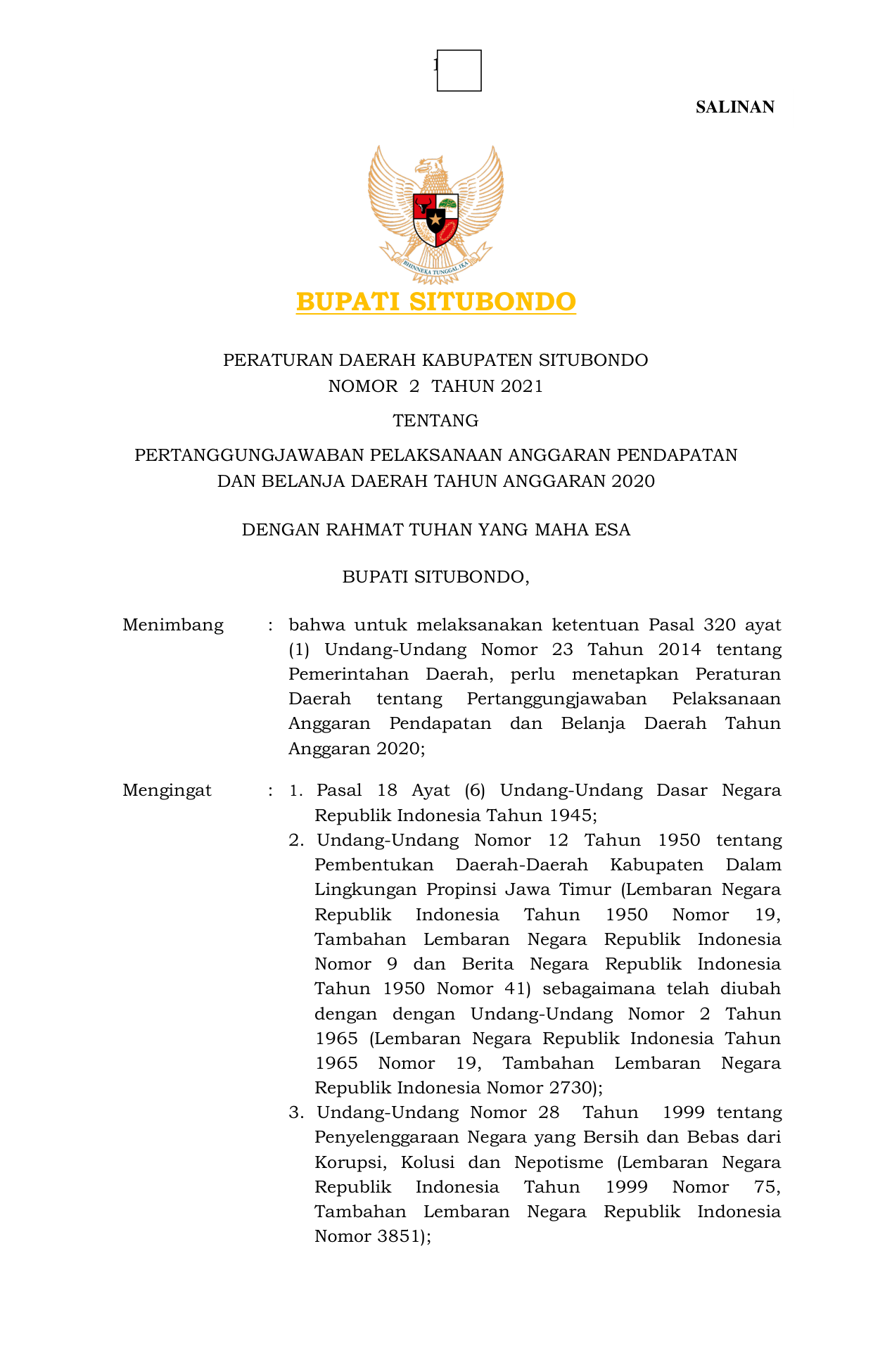 PERDA Nomor 2 Tahun 2021 | Peraturan Daerah Nomor 2 Tahun 2021 tentang PERTANGGUNGJAWABAN PELAKSANAAN ANGGARAN PENDAPATAN DAN BELANJA DAERAH TAHUN ANGGARAN 2020