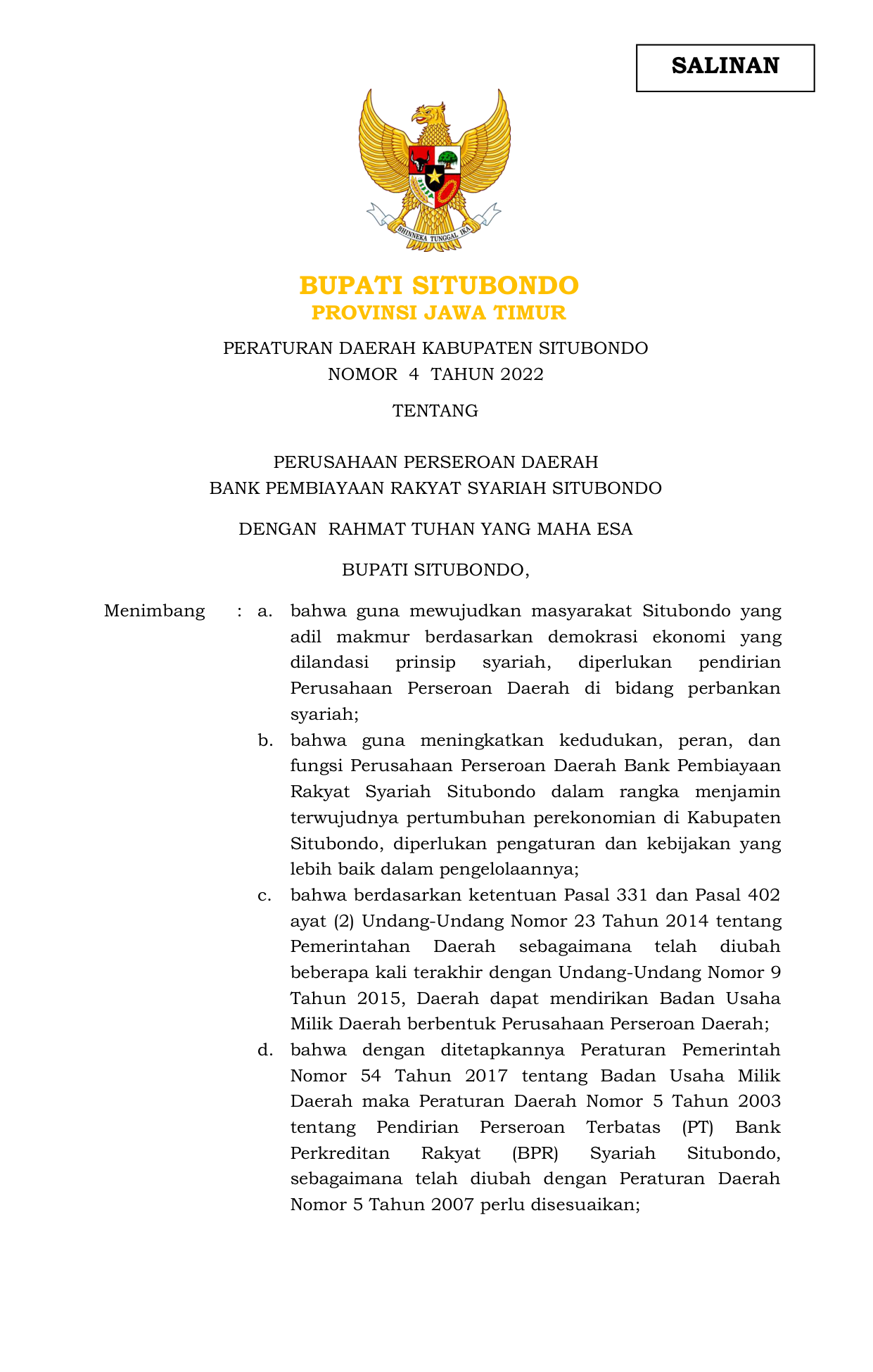 PERDA Nomor 4 Tahun 2022 | Peraturan Daerah Nomor 4 Tahun 2022 tentang PERUSAHAAN PERSEROAN DAERAH BANK PEMBIAYAAN RAKYAT SYARIAH SITUBONDO