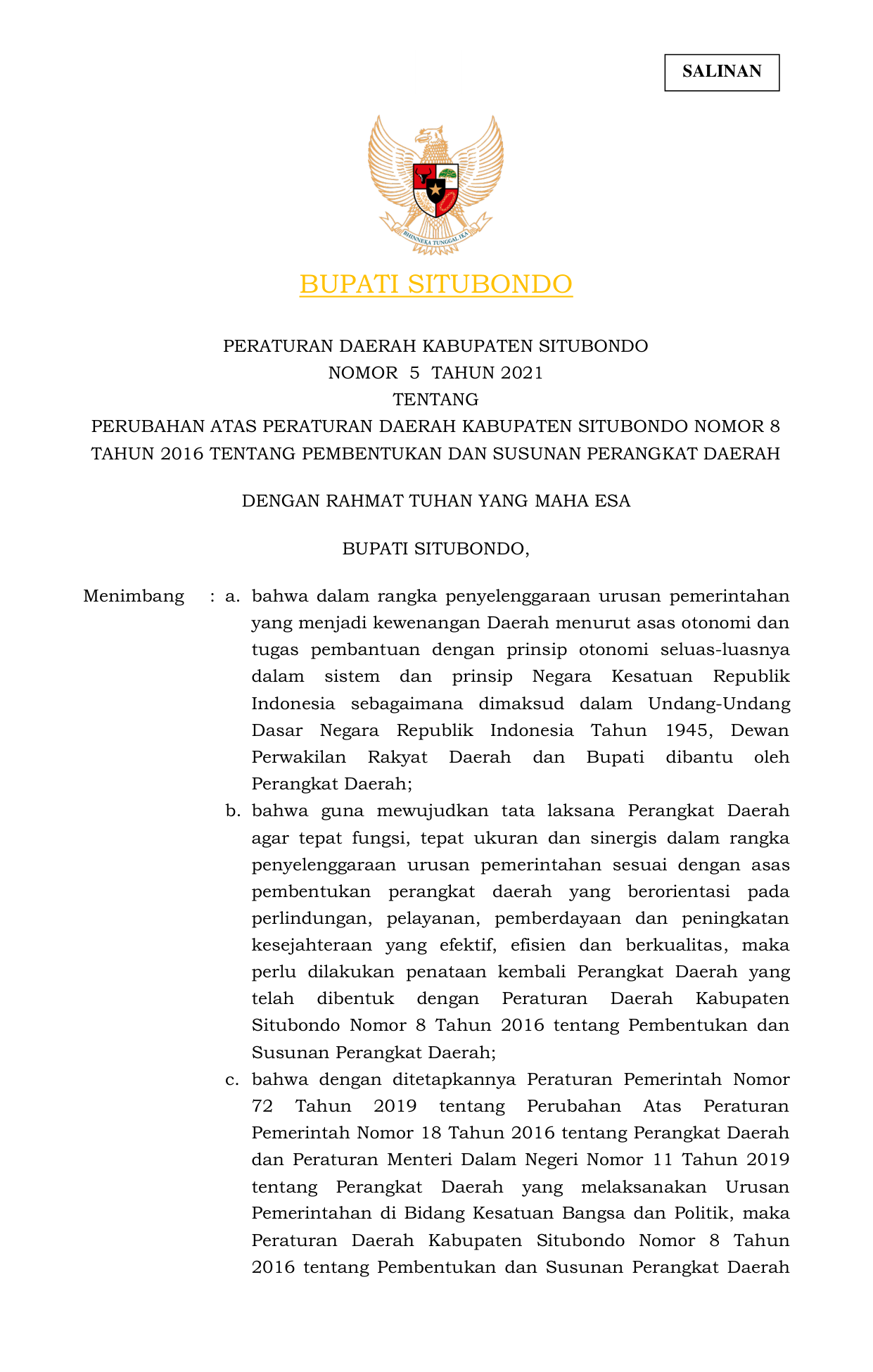 PERDA Nomor 5 Tahun 2021 | Peraturan Daerah Nomor 5 Tahun 2021 tentang PERUBAHAN ATAS PERATURAN DAERAH KABUPATEN SITUBONDO NOMOR 8 TAHUN 2016 TENTANG PEMBENTUKAN DAN SUSUNAN PERANGKAT DAERAH