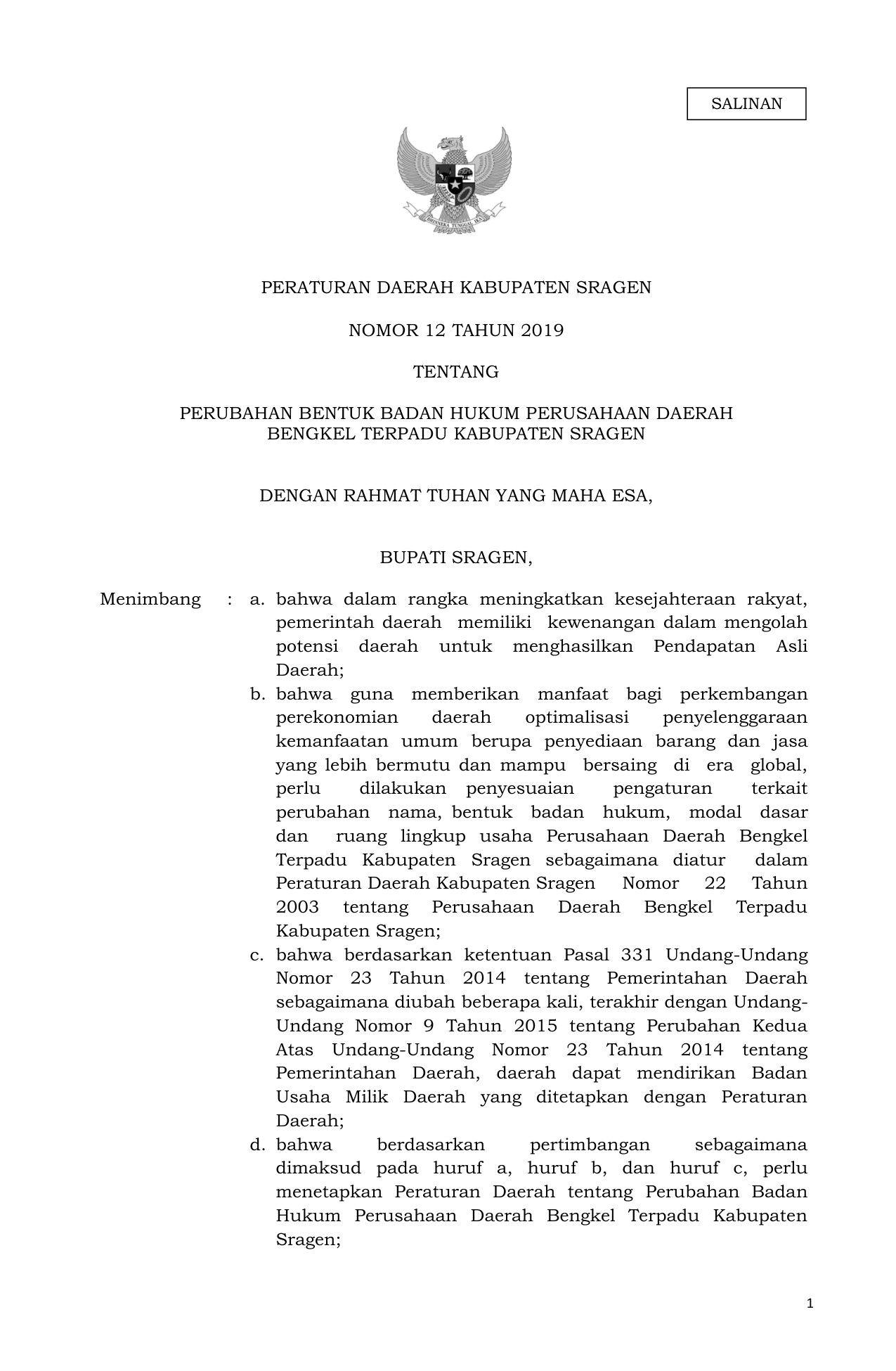 PERDA Nomor 12 Tahun 2019 | Peraturan Daerah Nomor 12 Tahun 2019 tentang PERUBAHAN BENTUK BADAN HUKUM PERUSAHAAN DAERAH BENGKEL TERPADU KABUPATEN SRAGEN