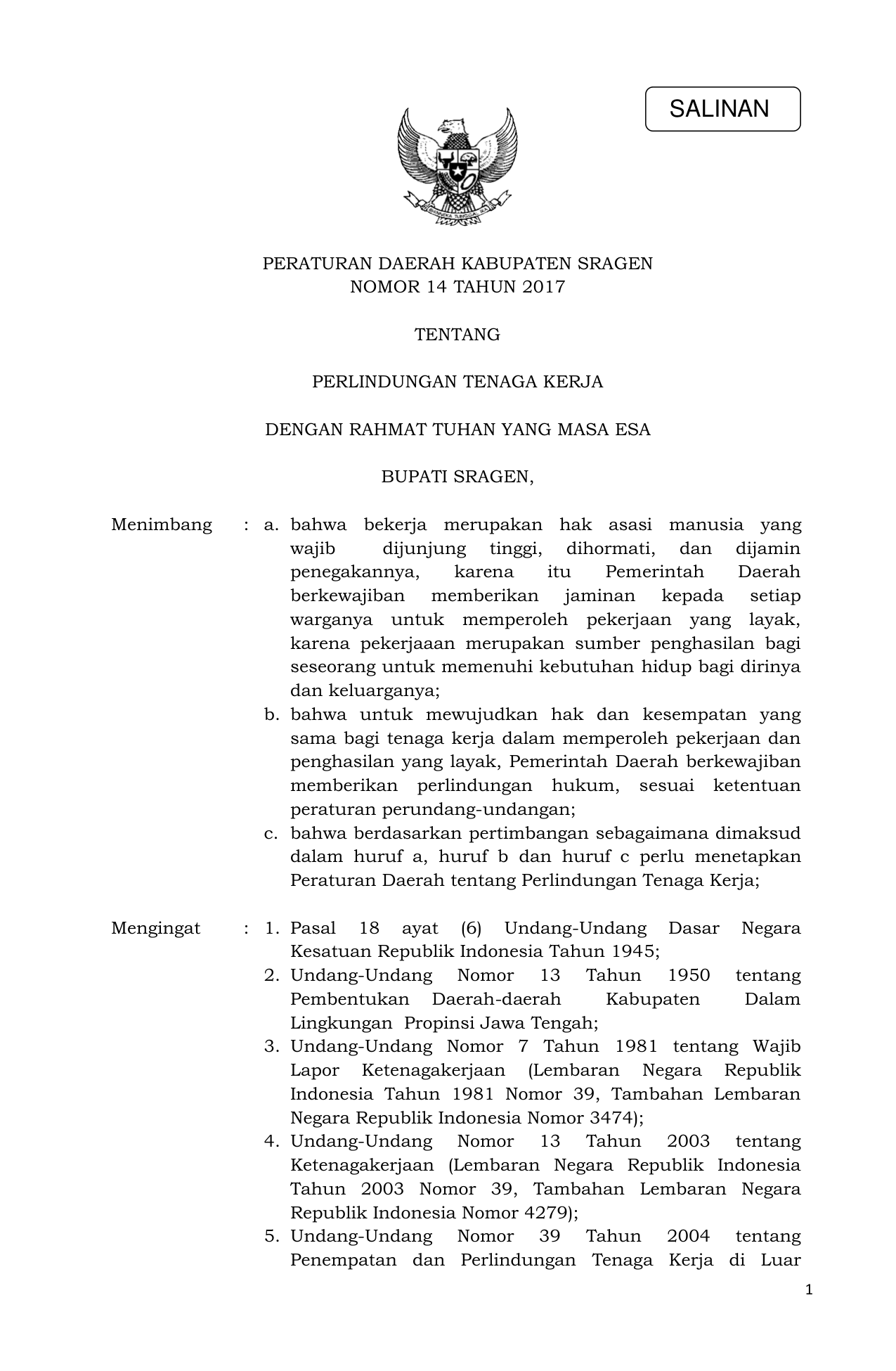 PERDA Nomor 14 Tahun 2017 | Peraturan Daerah Nomor 14 Tahun 2017 tentang PERLINDUNGAN TENAGA KERJA