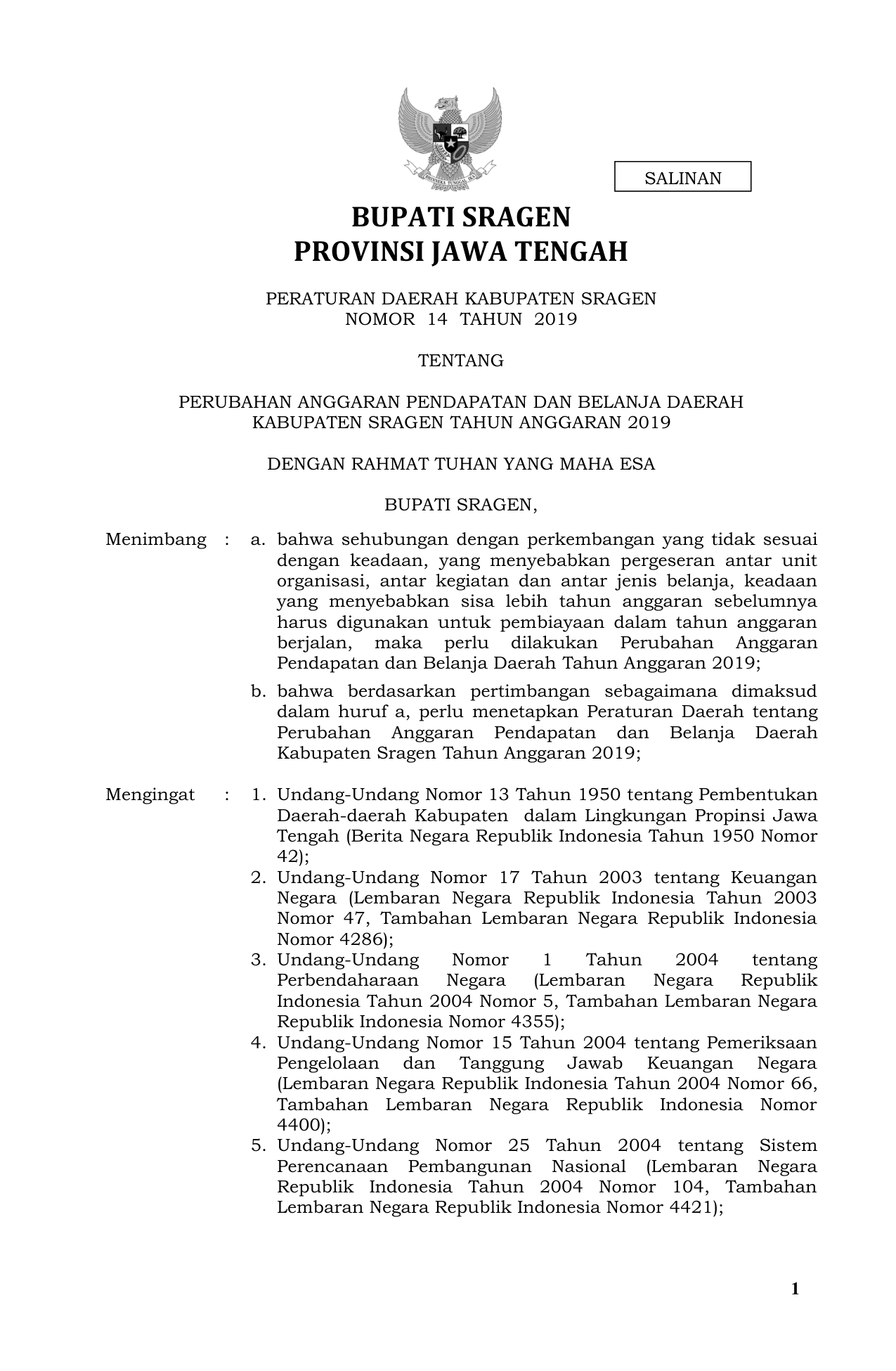 PERDA Nomor 14 Tahun 2019 | Peraturan Daerah Nomor 14 Tahun 2019 tentang PERUBAHAN ANGGARAN PENDAPATAN DAN BELANJA DAERAH KABUPATEN SRAGEN TAHUN ANGGARAN 2019