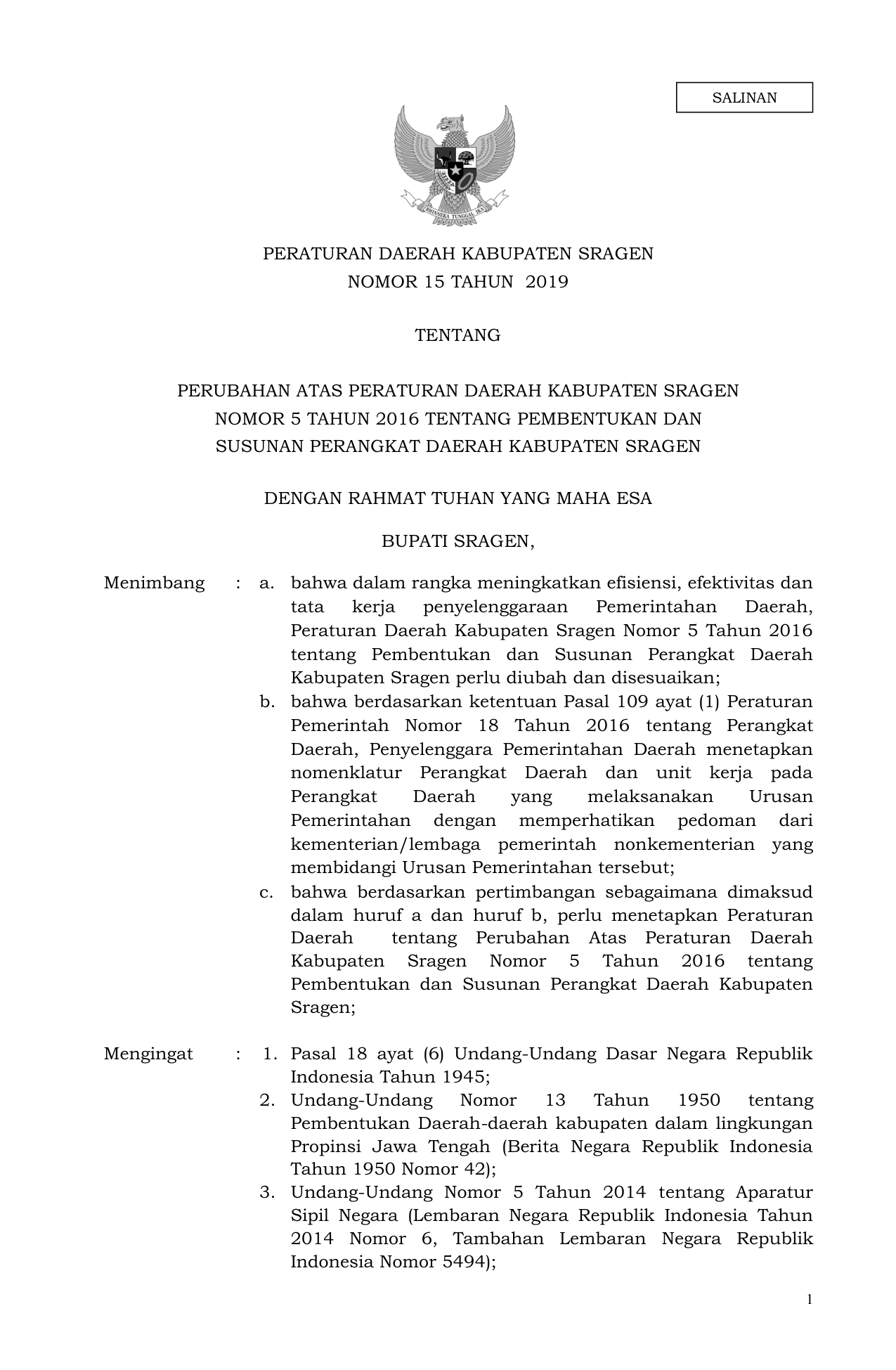 PERDA Nomor 15 Tahun 2019 | Peraturan Daerah Nomor 15 Tahun 2019 tentang PERUBAHAN ATAS PERATURAN DAERAH KABUPATEN SRAGENNOMOR 5 TAHUN 2016 TENTANG PEMBENTUKAN DANSUSUNAN PERANGKAT DAERAH KABUPATEN SRAGEN
