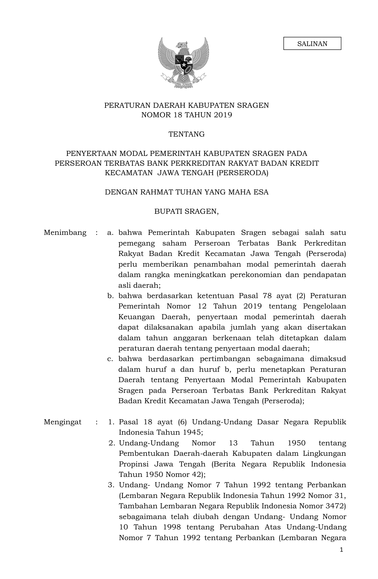 PERDA Nomor 18 Tahun 2022 | Peraturan Daerah Nomor 18 Tahun 2022 tentang PENYERTAAN MODAL PEMERINTAH KABUPATEN SRAGEN PADA PERSEROAN TERBATAS BANK PERKREDITAN RAKYAT BADAN KREDIT KECAMATAN JAWA TENGAH (PERSERODA)
