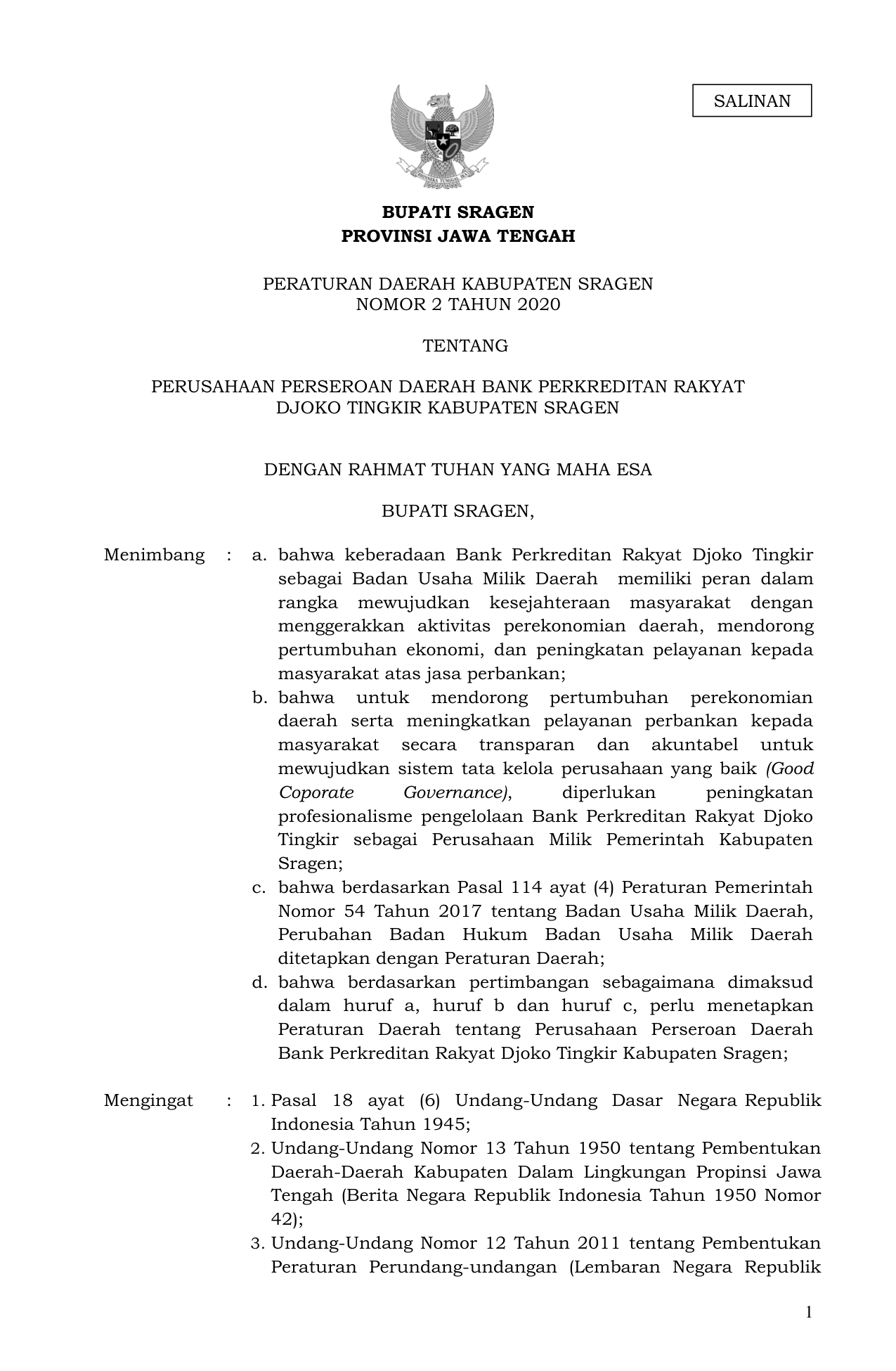 PERDA Nomor 2 Tahun 2020 | Peraturan Daerah Nomor 2 Tahun 2020 tentang PERUSAHAAN PERSEROAN DAERAH BANK PERKREDITAN RAKYATDJOKO TINGKIR KABUPATEN SRAGEN