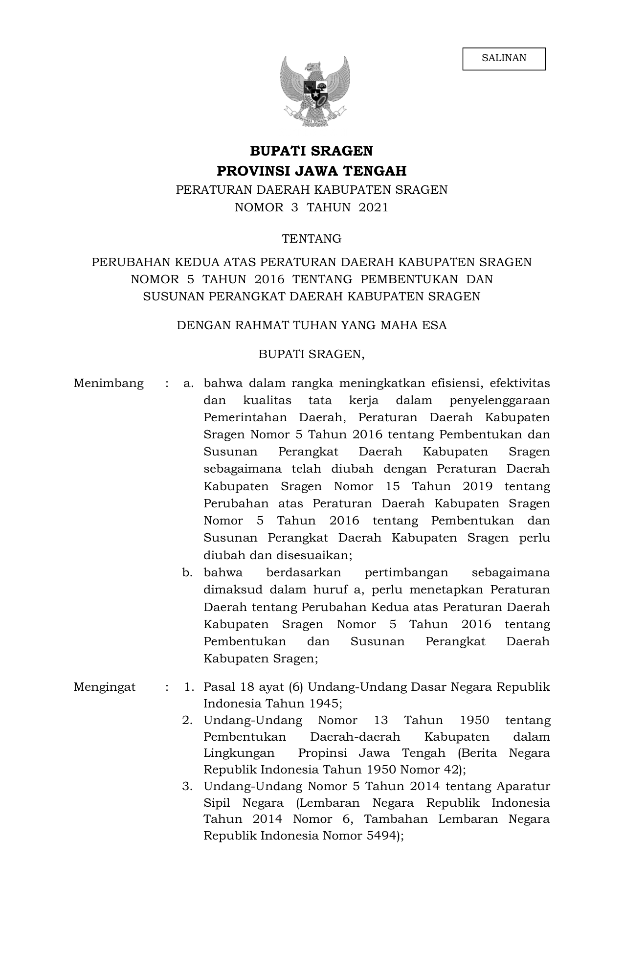 PERDA Nomor 3 Tahun 2021 | Peraturan Daerah Nomor 3 Tahun 2021 tentang PERUBAHAN KEDUA ATAS PERATURAN DAERAH KABUPATEN SRAGENNOMOR 5 TAHUN 2016 TENTANG PEMBENTUKAN DANSUSUNAN PERANGKAT DAERAH KABUPATEN SRAGEN