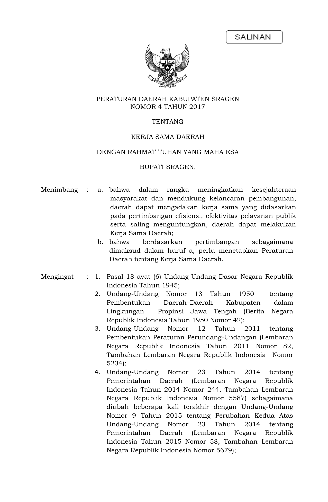 PERDA Nomor 4 Tahun 2017 | Peraturan Daerah Nomor 4 Tahun 2017 tentang KERJA SAMA DAERAH