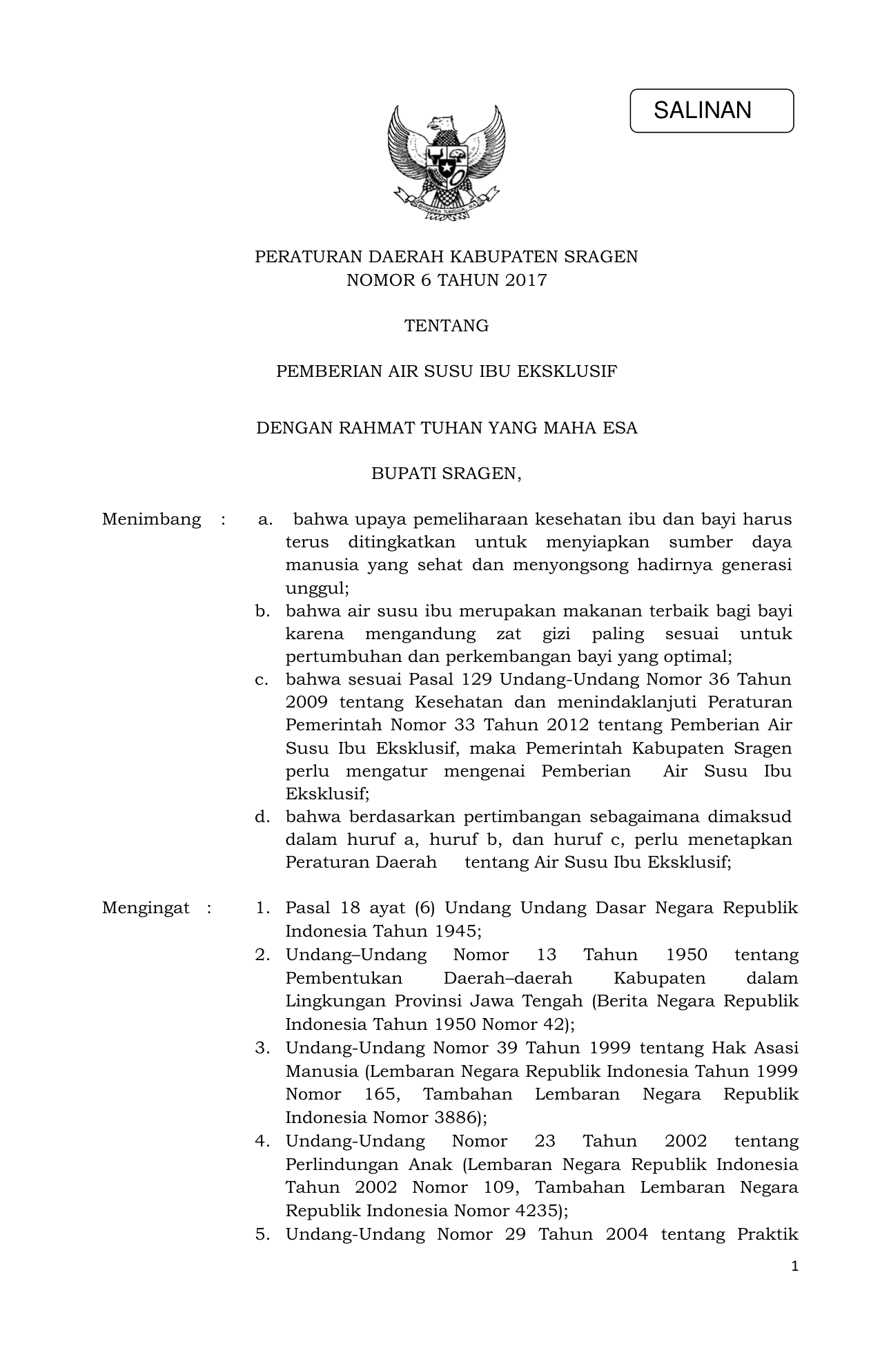 PERDA Nomor 6 Tahun 2017 | Peraturan Daerah Nomor 6 Tahun 2017 tentang PEMBERIAN AIR SUSU IBU EKSKLUSIF