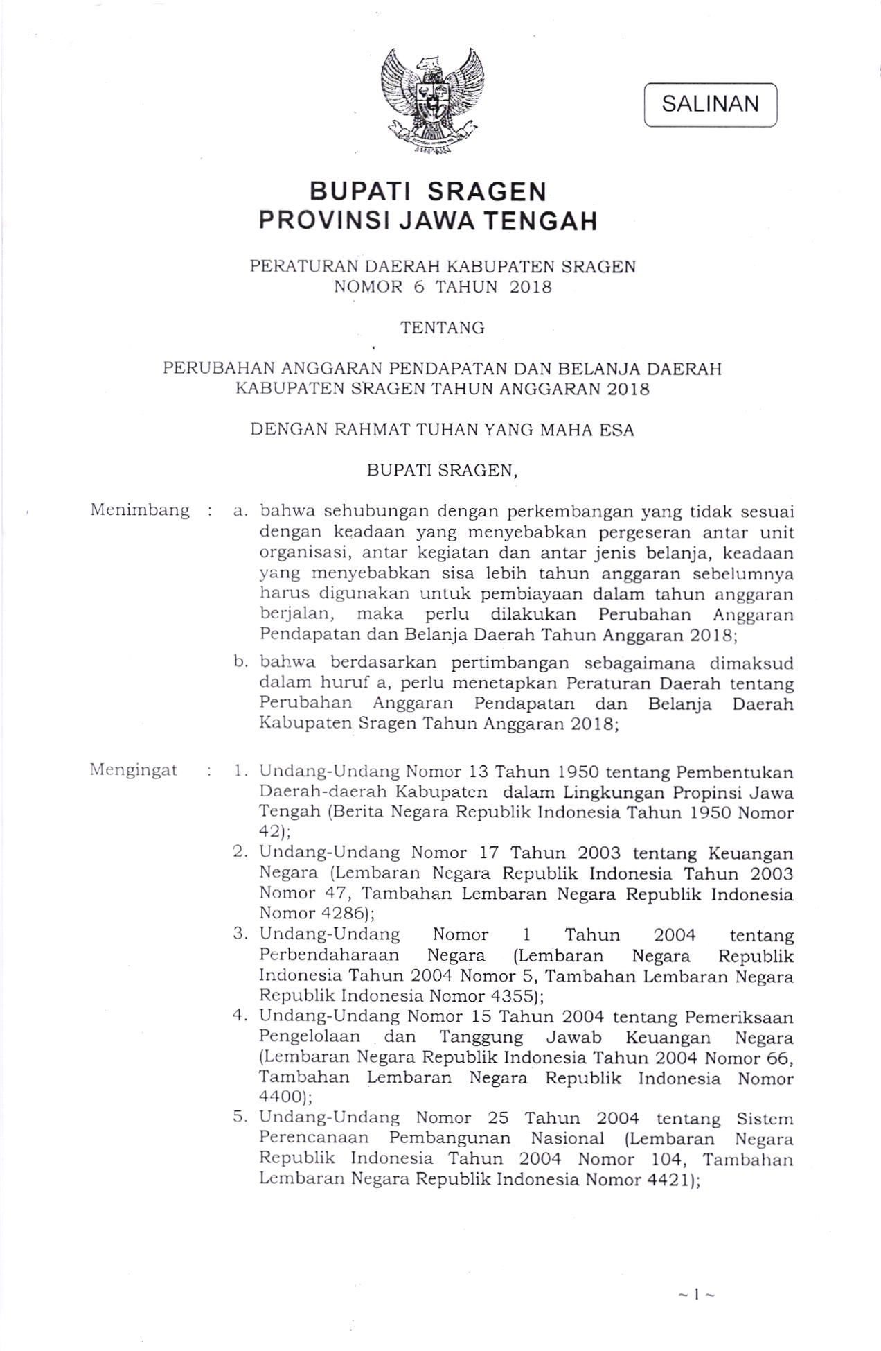 PERDA Nomor 6 Tahun 2018 | Peraturan Daerah Nomor 6 Tahun 2018 tentang PERUBAHAN ANGGARAN PENDAPATAN DAN BELANJA DAERAH KABUPATEN SRAGEN TAHUN ANGGARAN 20I8