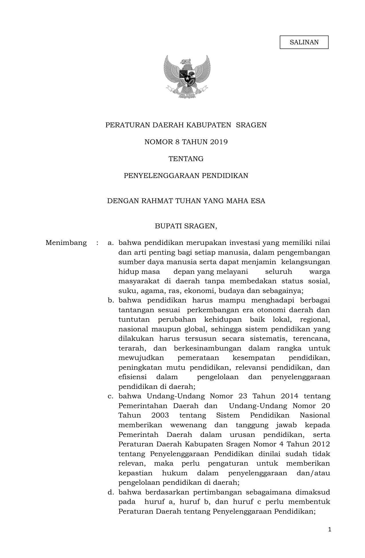 PERDA Nomor 8 Tahun 2019 | Peraturan Daerah Nomor 8 Tahun 2019 tentang PENYELENGGARAAN PENDIDIKAN