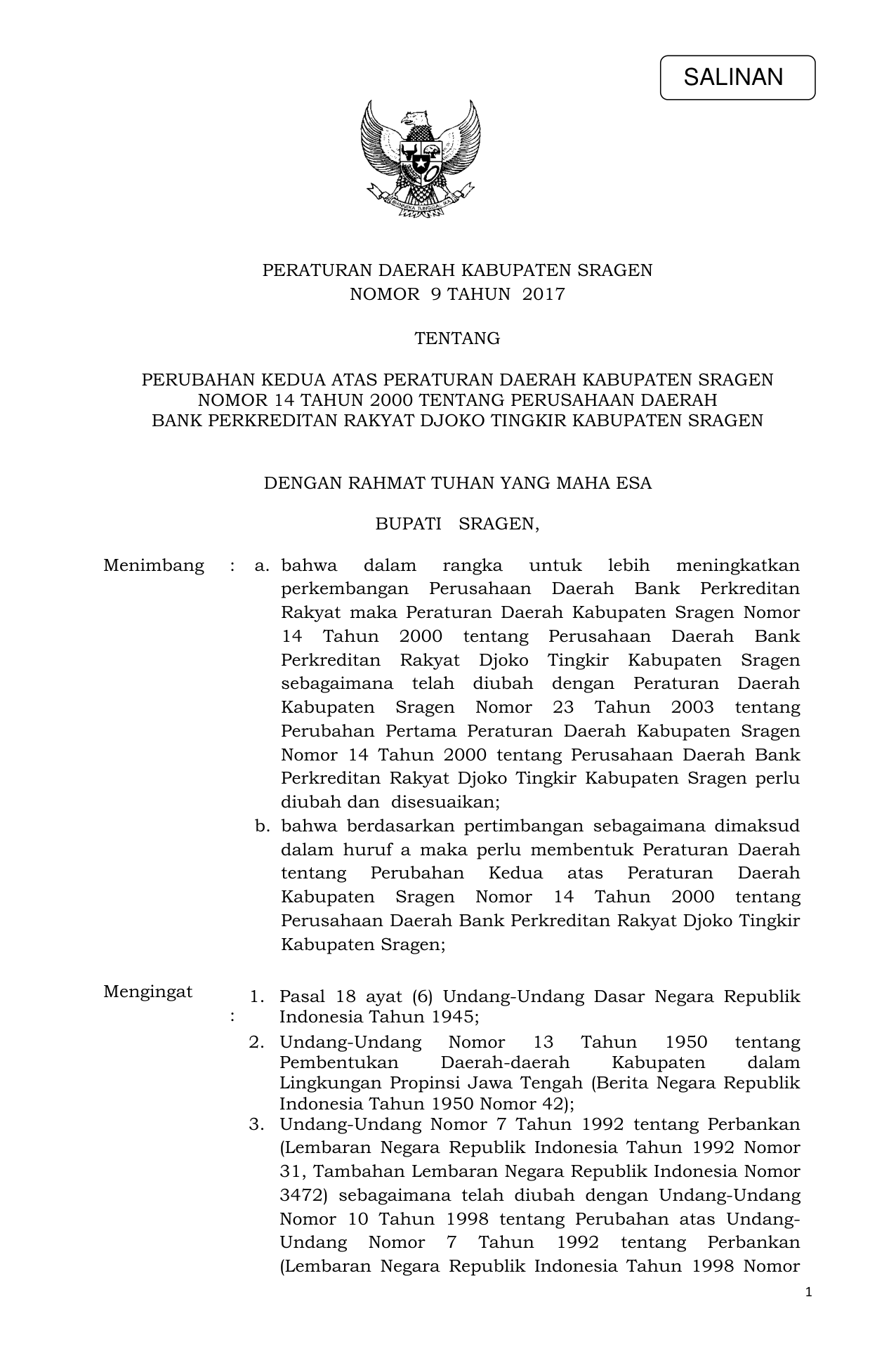PERDA Nomor 9 Tahun 2017 | Peraturan Daerah Nomor 9 Tahun 2017 tentang PERUBAHAN KEDUA ATAS PERATURAN DAERAH KABUPATEN SRAGEN NOMOR 14 TAHUN 2000 TENTANG PERUSAHAAN DAERAH BANK PERKREDITAN RAKYAT DJOKO TINGKIR KABUPATEN SRAGEN