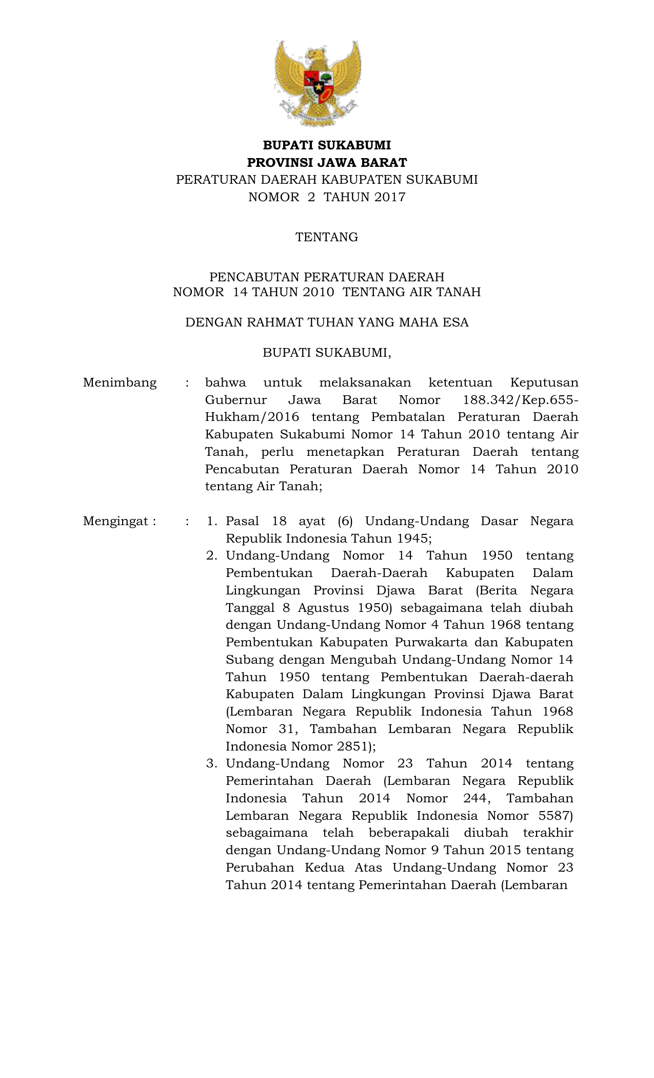 PERDA Nomor 2 Tahun 2017 | Peraturan Daerah Nomor 2 Tahun 2017 tentang PENCABUTAN PERATURAN DAERAHNOMOR 14 TAHUN 2010 TENTANG AIR TANAH