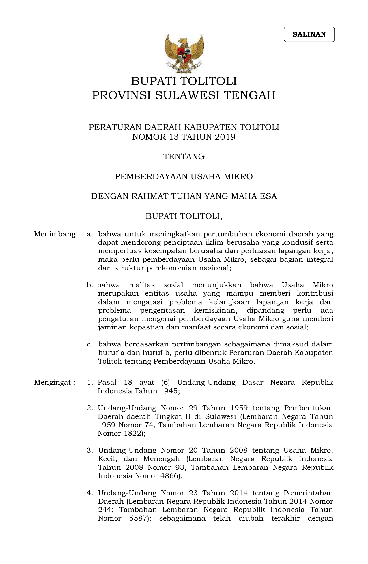 PERDA Nomor 13 Tahun 2019 | Peraturan Daerah Nomor 13 Tahun 2019 tentang PEMBERDAYAAN USAHA MIKRO