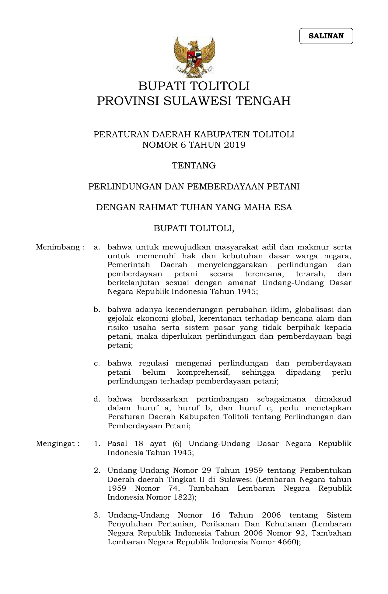 PERDA Nomor 6 Tahun 2019 | Peraturan Daerah Nomor 6 Tahun 2019 tentang PERLINDUNGAN DAN PEMBERDAYAAN PETANI