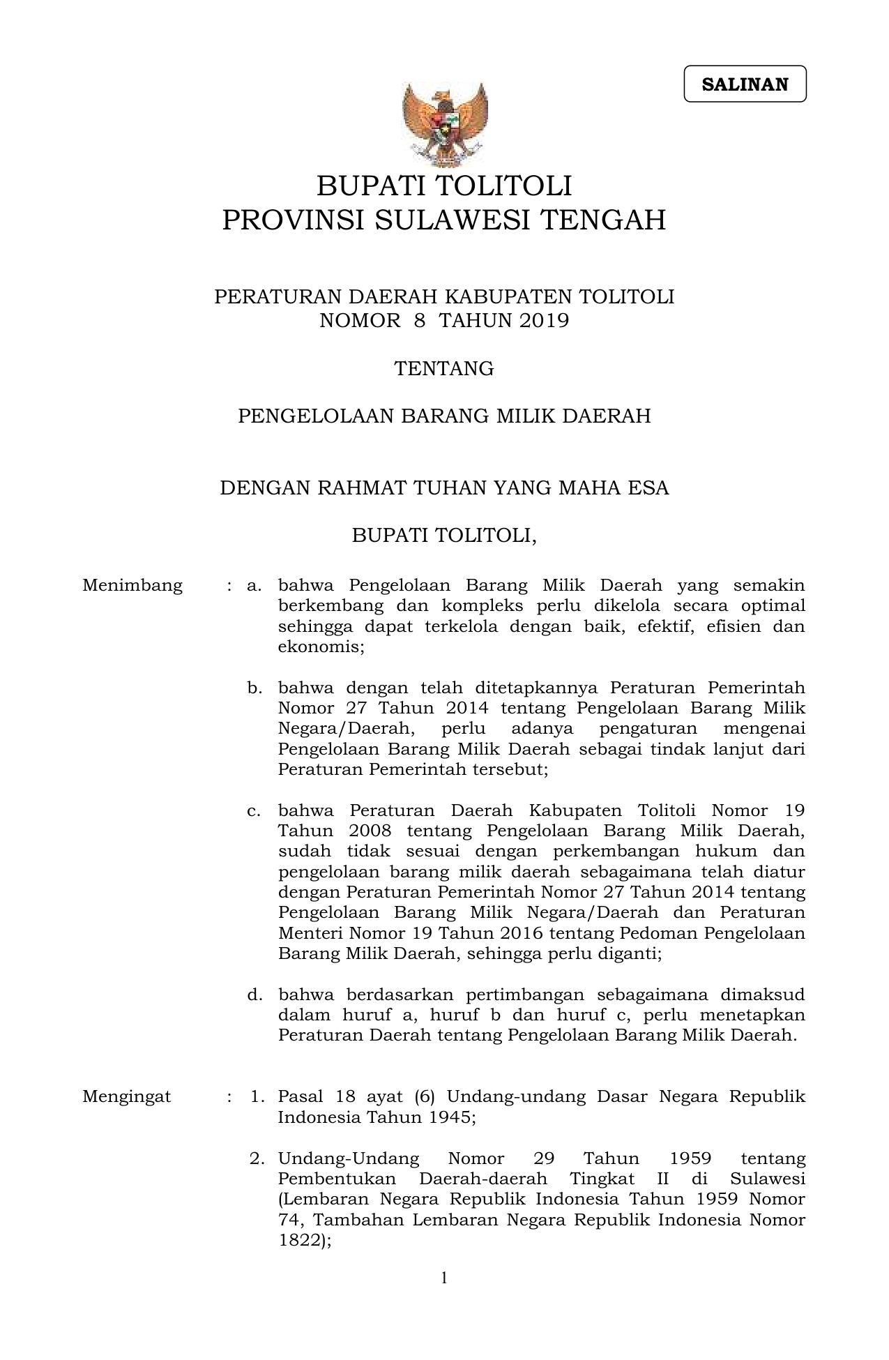 PERDA Nomor 8 Tahun 2019 | Peraturan Daerah Nomor 8 Tahun 2019 tentang PENGELOLAAN BARANG MILIK DAERAH