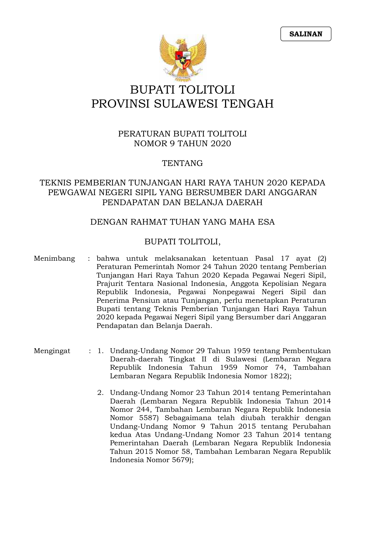 PERDA Nomor 9 Tahun 2020 | Peraturan Daerah Nomor 9 Tahun 2020 tentang TEKNIS PEMBERIAN TUNJANGAN HARI RAYA TAHUN 2020 KEPADA PEWGAWAI NEGERI SIPIL YANG BERSUMBER DARI ANGGARAN PENDAPATAN DAN BELANJA DAERAH