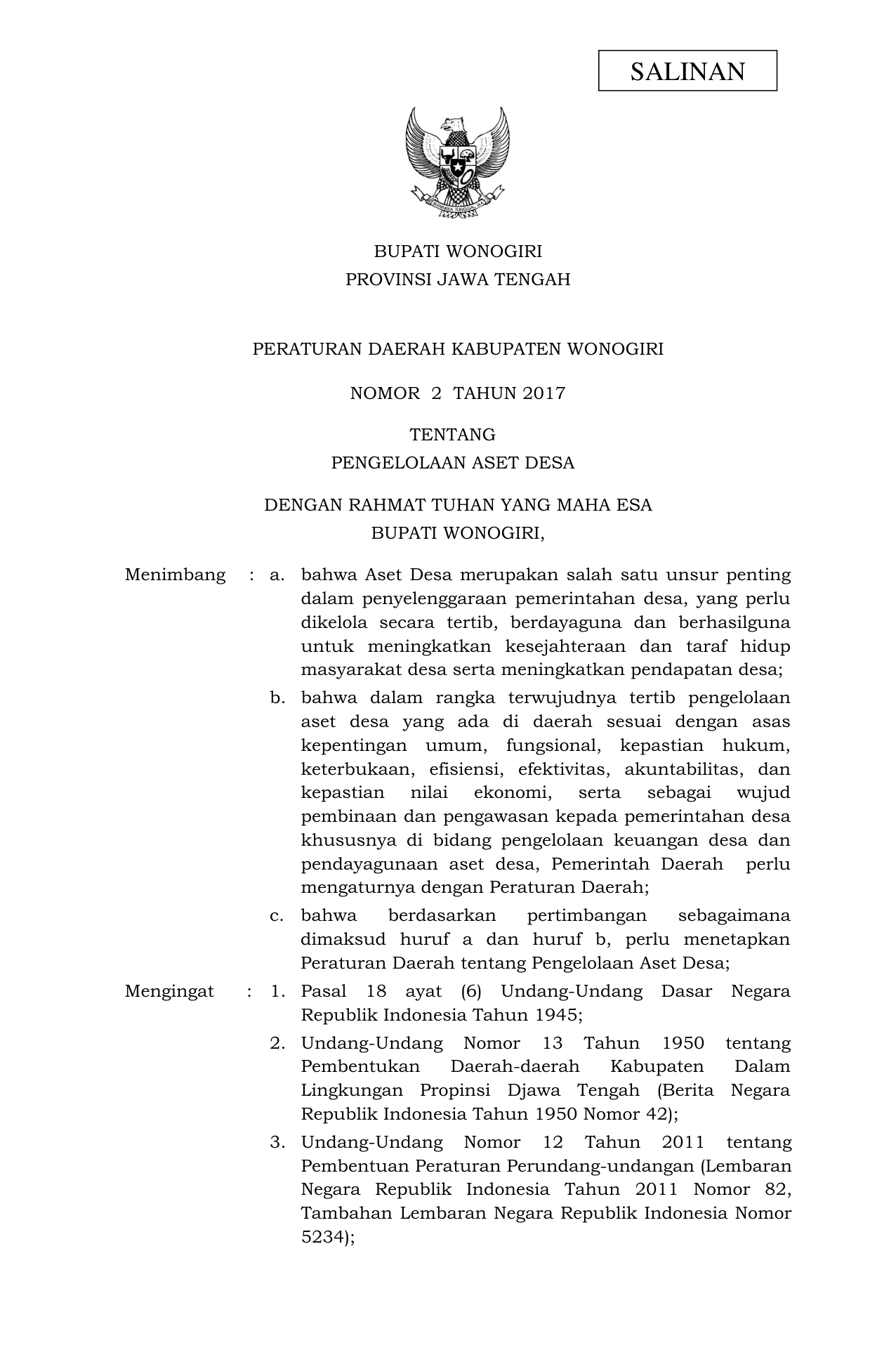 PERDA Nomor 2 Tahun 2017 | Peraturan Daerah Nomor 2 Tahun 2017 tentang PENGELOLAAN ASET DESA