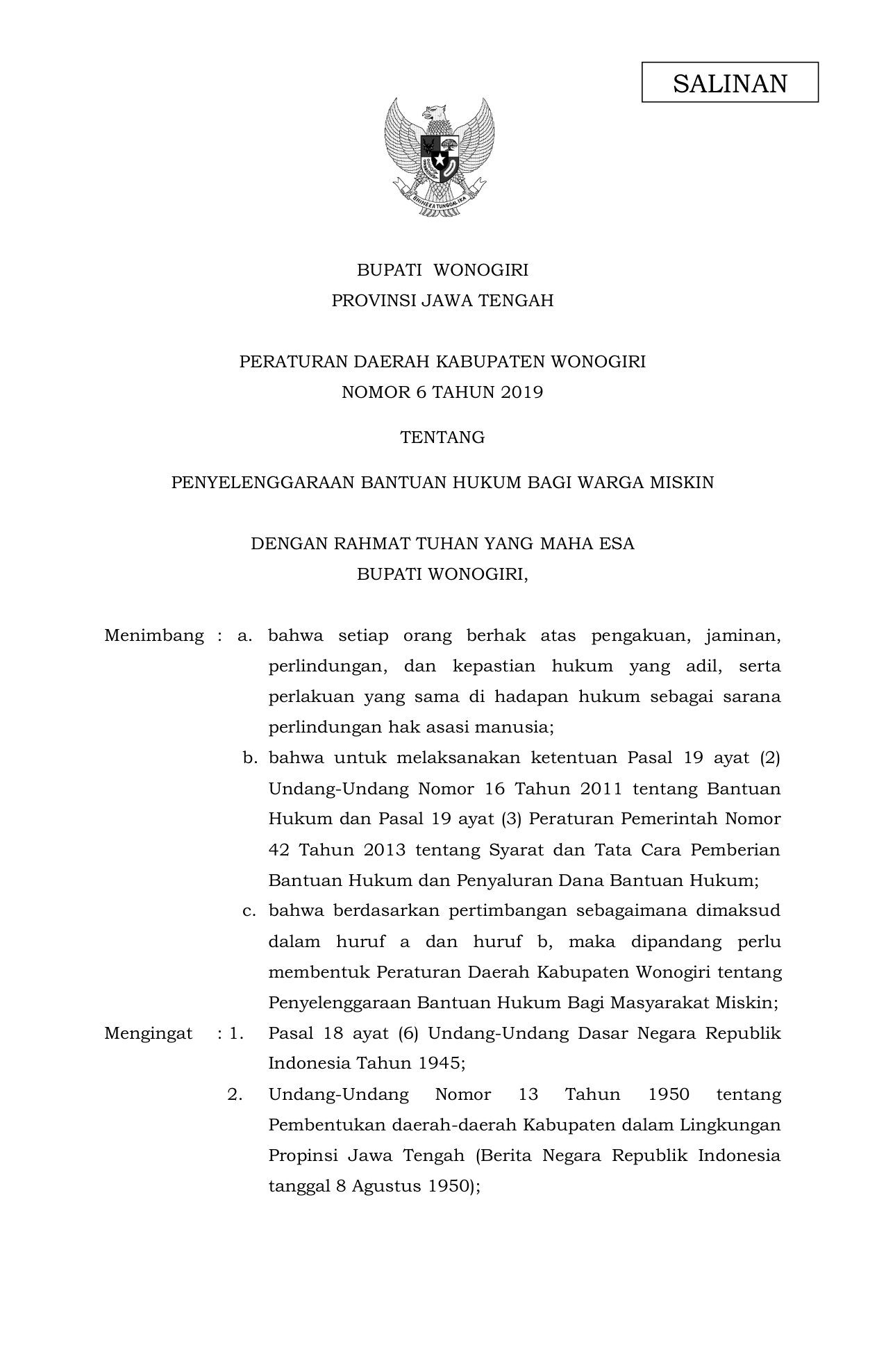 PERDA Nomor 6 Tahun 2019 | Peraturan Daerah Nomor 6 Tahun 2019 tentang PENYELENGGARAAN BANTUAN HUKUM BAGI WARGA MISKIN