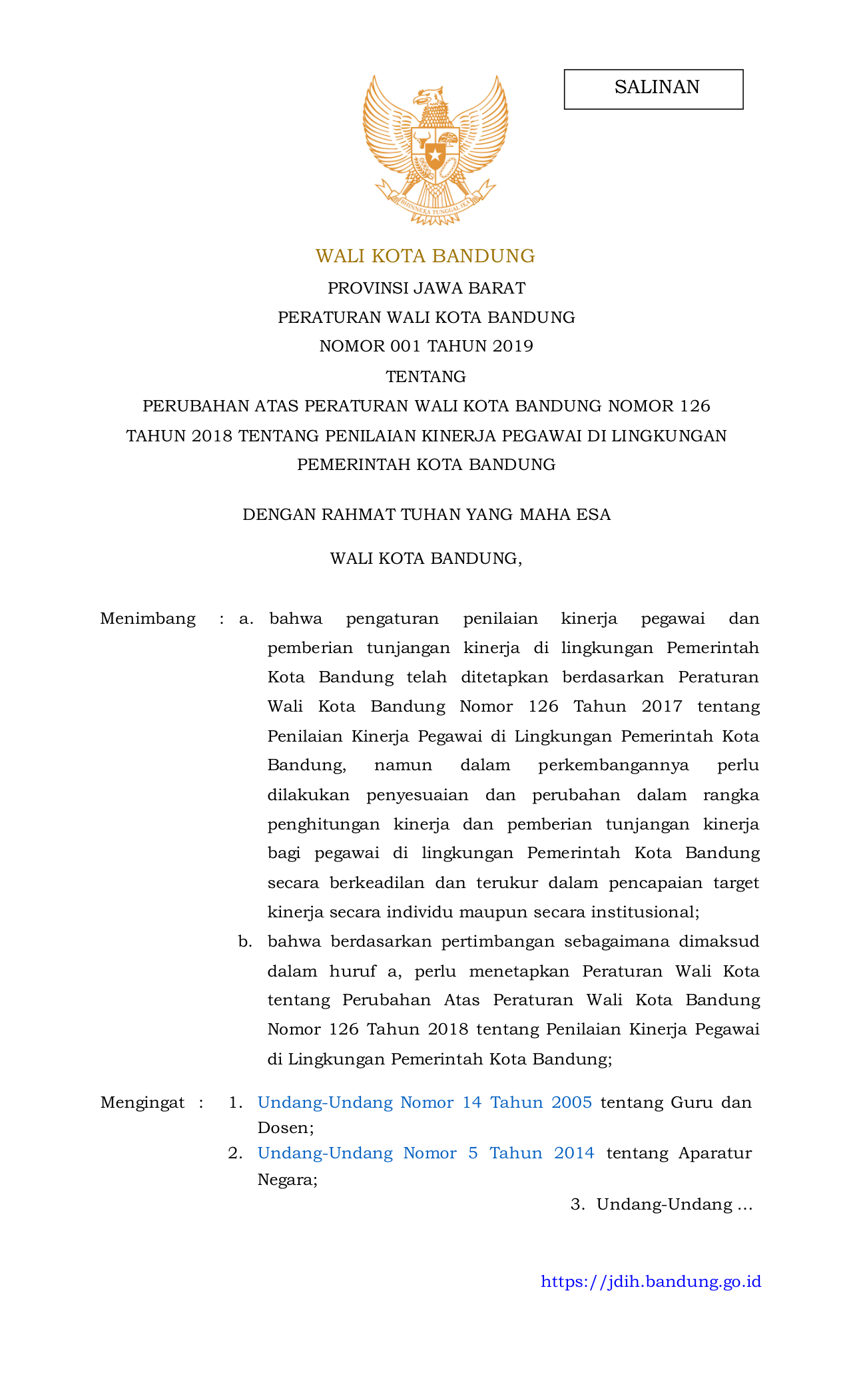 PERDA Nomor 001 Tahun 2019 | Peraturan Daerah Nomor 001 Tahun 2019 tentang PERUBAHAN ATAS PERATURAN WALI KOTA BANDUNG NOMOR 126 TAHUN 2018 TENTANG PENILAIAN KINERJA PEGAWAI DI LINGKUNGAN PEMERINTAH KOTA BANDUNG
