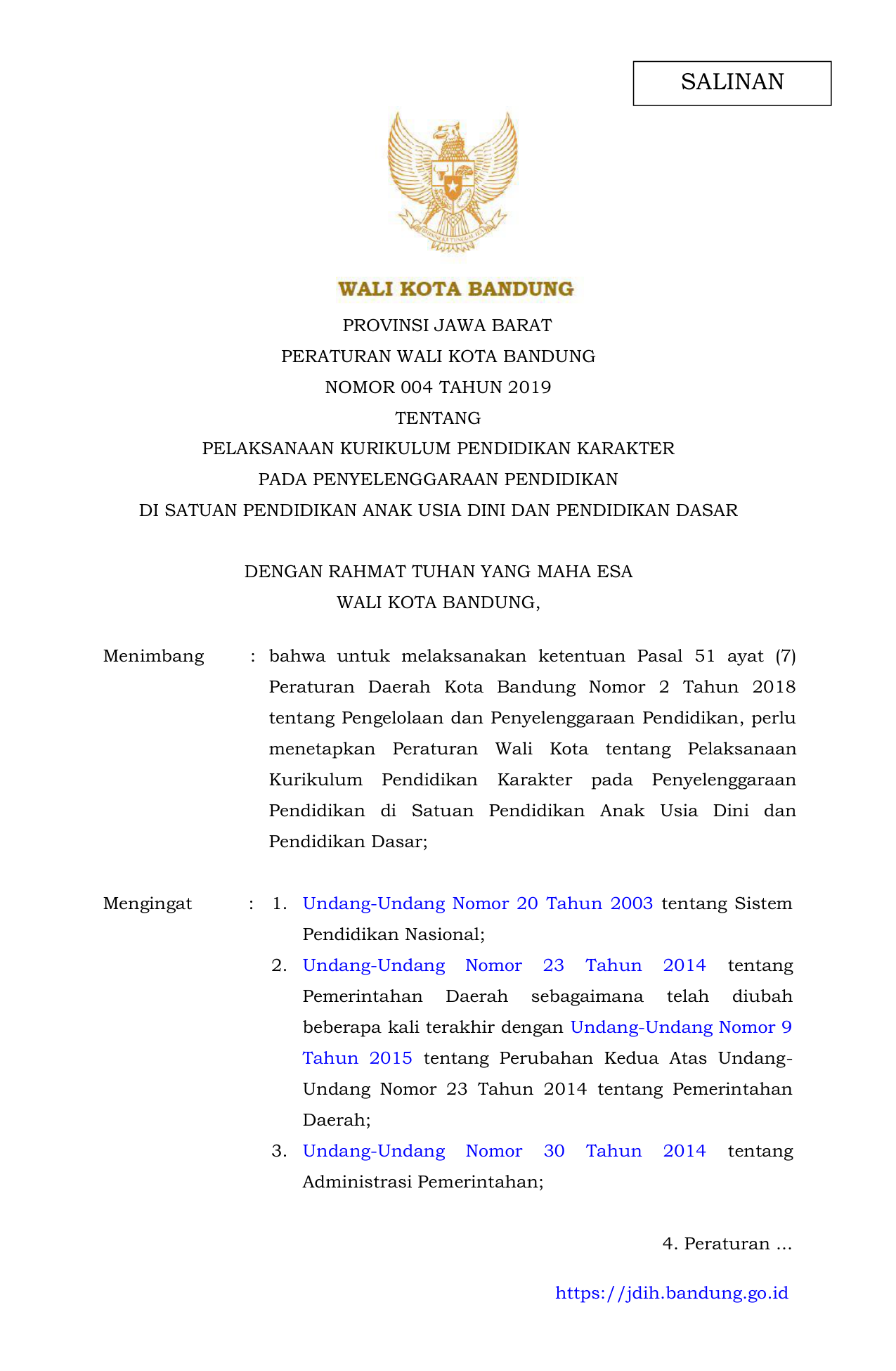 PERDA Nomor 004 Tahun 2019 | Peraturan Daerah Nomor 004 Tahun 2019 tentang PELAKSANAAN KURIKULUM PENDIDIKAN KARAKTER PADA PENYELENGGARAAN PENDIDIKAN DI SATUAN PENDIDIKAN ANAK USIA DINI DAN PENDIDIKAN DASAR