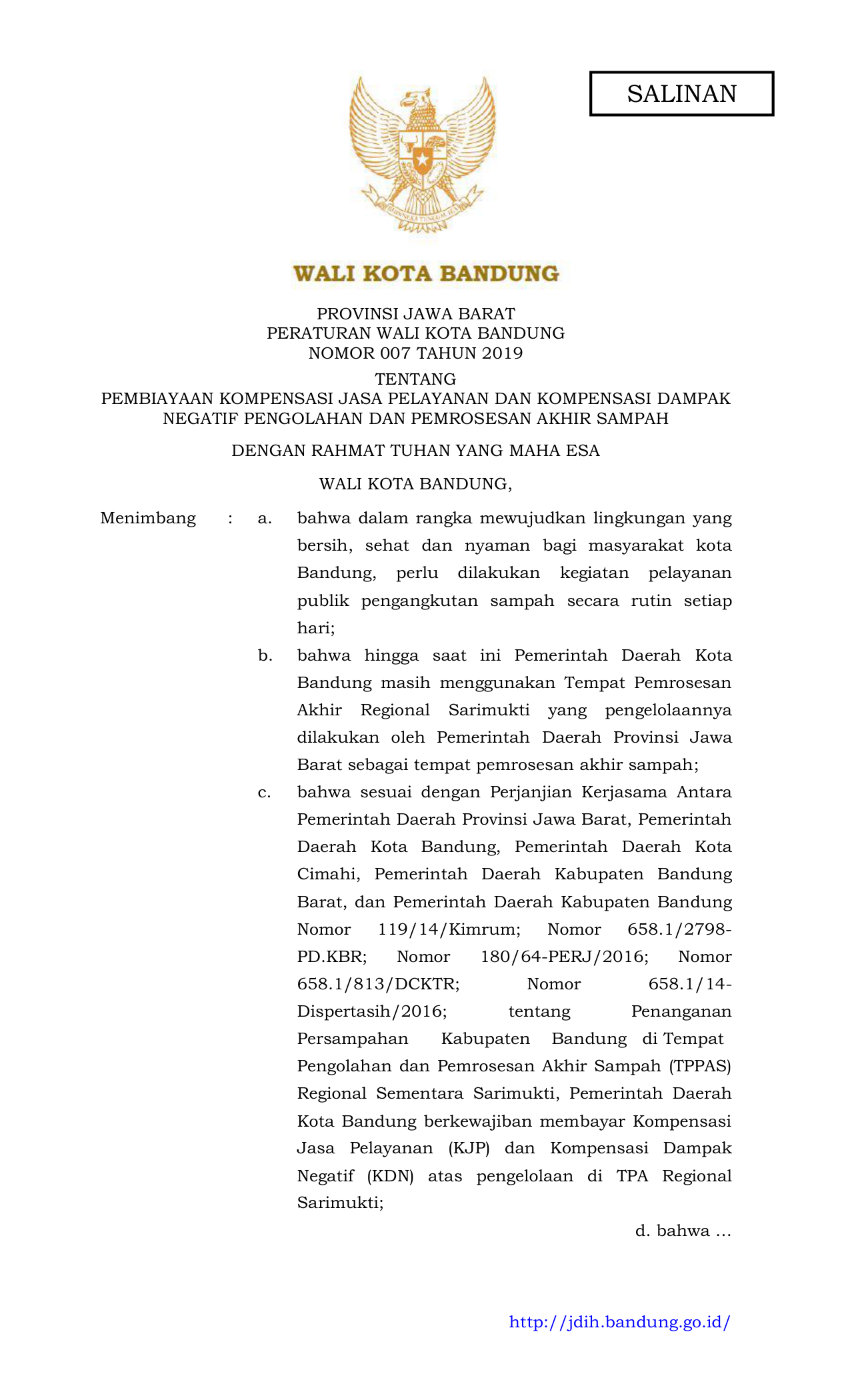 PERDA Nomor 007 Tahun 2019 | Peraturan Daerah Nomor 007 Tahun 2019 tentang PEMBIAYAAN KOMPENSASI JASA PELAYANAN DAN KOMPENSASI DAMPAK NEGATIF PENGOLAHAN DAN PEMROSESAN AKHIR SAMPAH