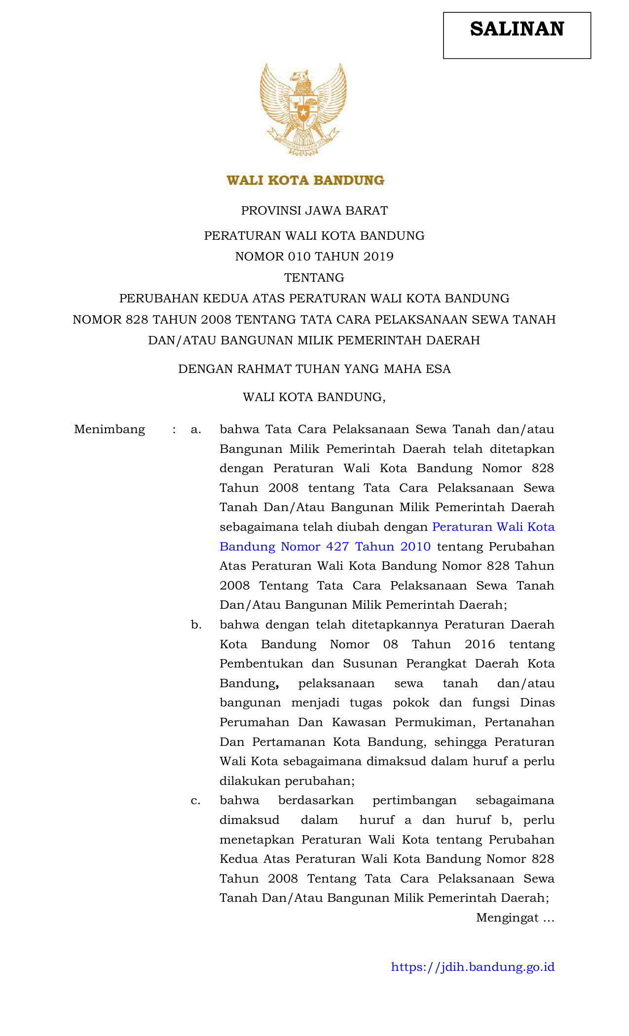 PERDA Nomor 010 Tahun 2019 | Peraturan Daerah Nomor 010 Tahun 2019 tentang PERUBAHAN KEDUA ATAS PERATURAN WALI KOTA BANDUNG NOMOR 828 TAHUN 2008 TENTANG TATA CARA PELAKSANAAN SEWA TANAH DAN/ATAU BANGUNAN MILIK PEMERINTAH DAERAH