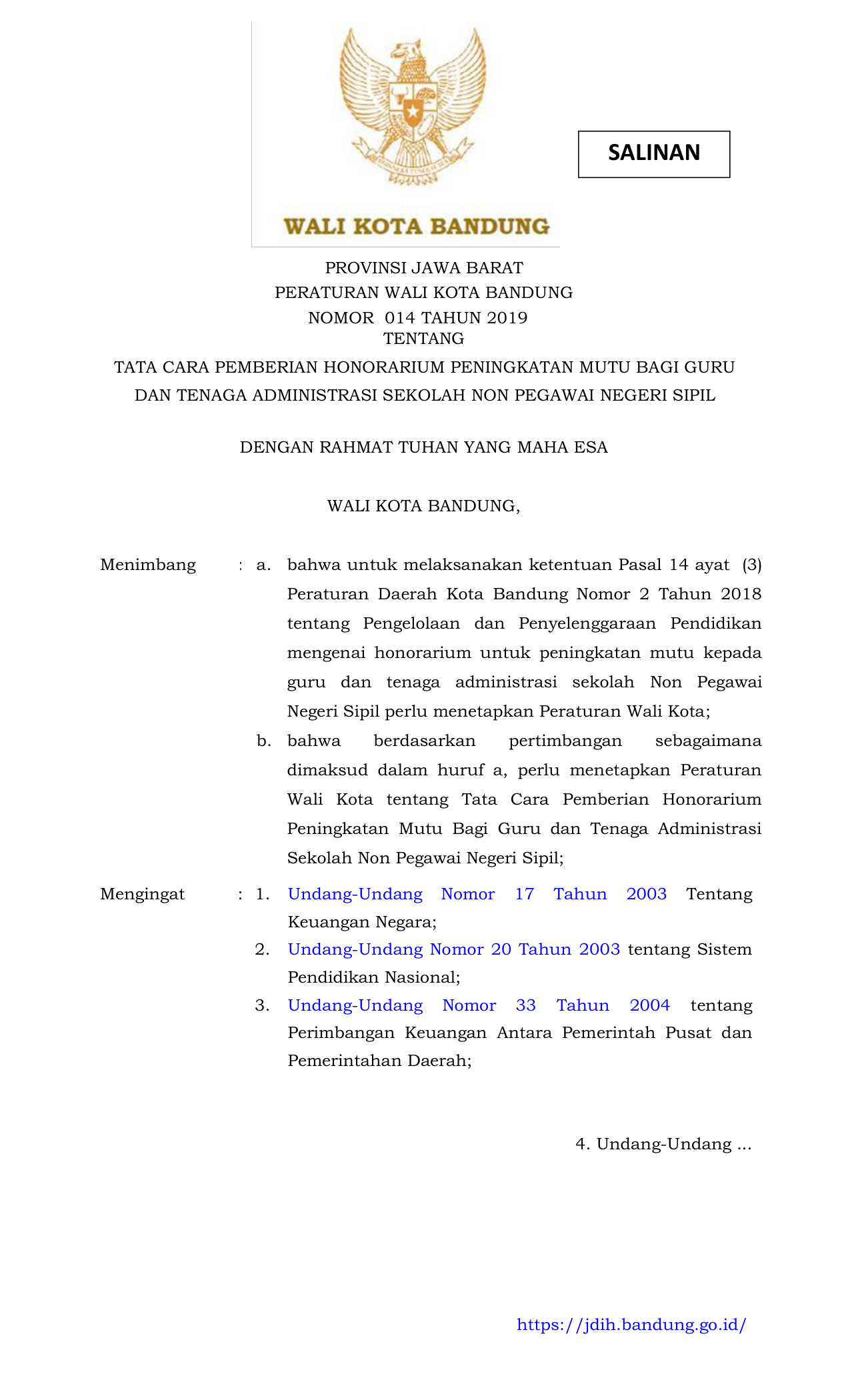 PERDA Nomor 014 Tahun 2019 | Peraturan Daerah Nomor 014 Tahun 2019 tentang TATA CARA PEMBERIAN HONORARIUM PENINGKATAN MUTU BAGI GURU DAN TENAGA ADMINISTRASI SEKOLAH NON PEGAWAI NEGERI SIPIL