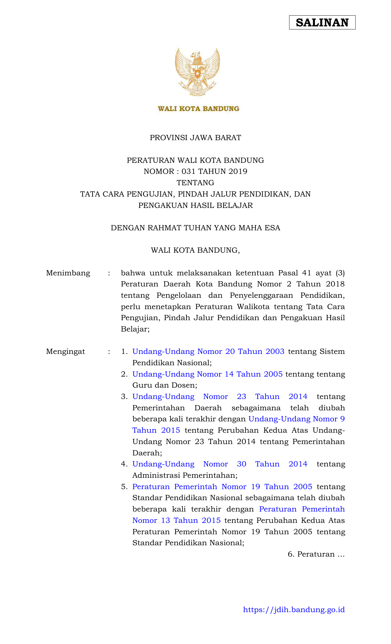PERDA Nomor 031 Tahun 2019 | Peraturan Daerah Nomor 031 Tahun 2019 tentang TATA CARA PENGUJIAN, PINDAH JALUR PENDIDIKAN, DAN PENGAKUAN HASIL BELAJAR