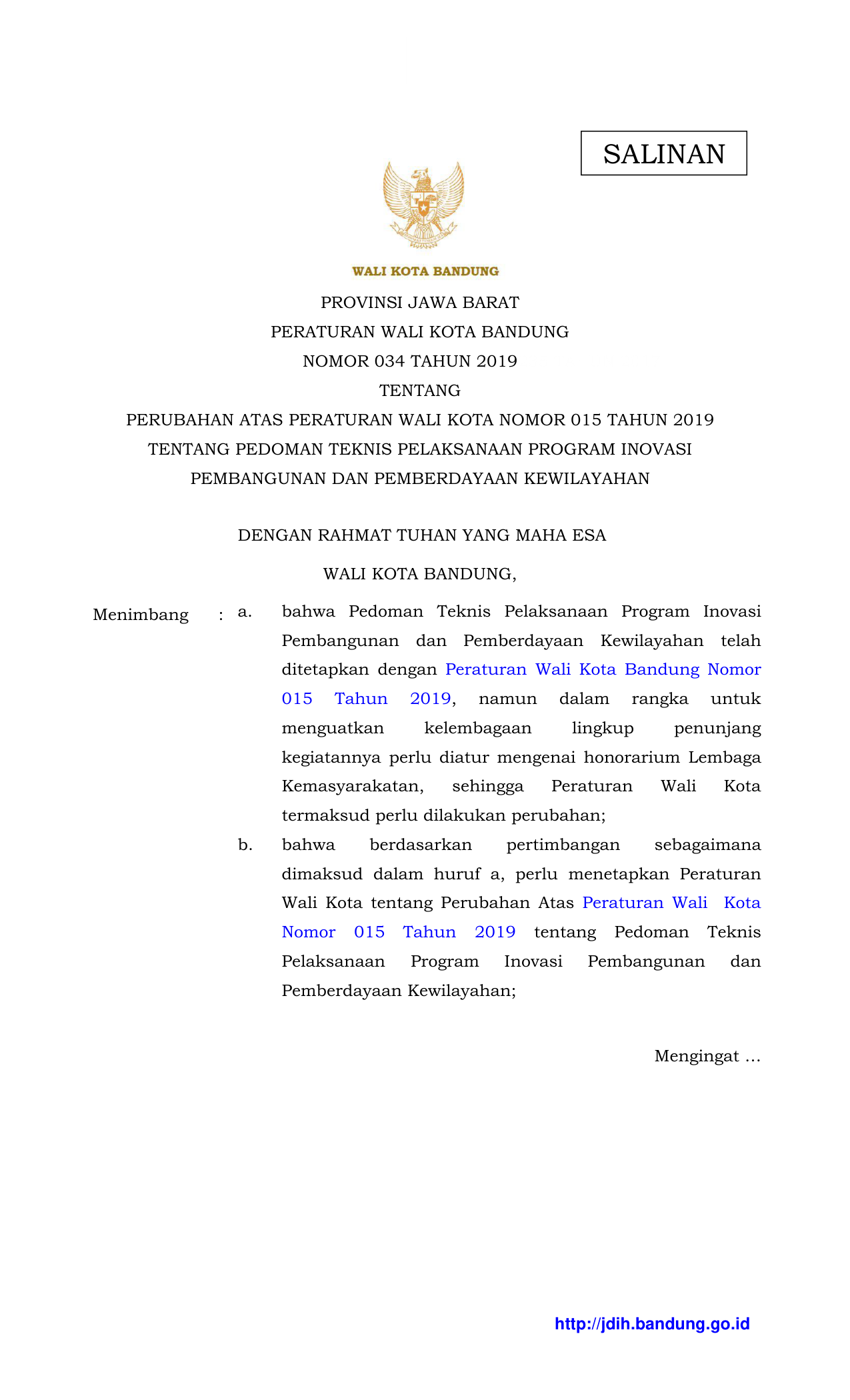 PERDA Nomor 034 Tahun 2019 | Peraturan Daerah Nomor 034 Tahun 2019 tentang PERUBAHAN ATAS PERATURAN WALI KOTA NOMOR 015 TAHUN 2019 TENTANG PEDOMAN TEKNIS PELAKSANAAN PROGRAM INOVASI PEMBANGUNAN DAN PEMBERDAYAAN KEWILAYAHAN