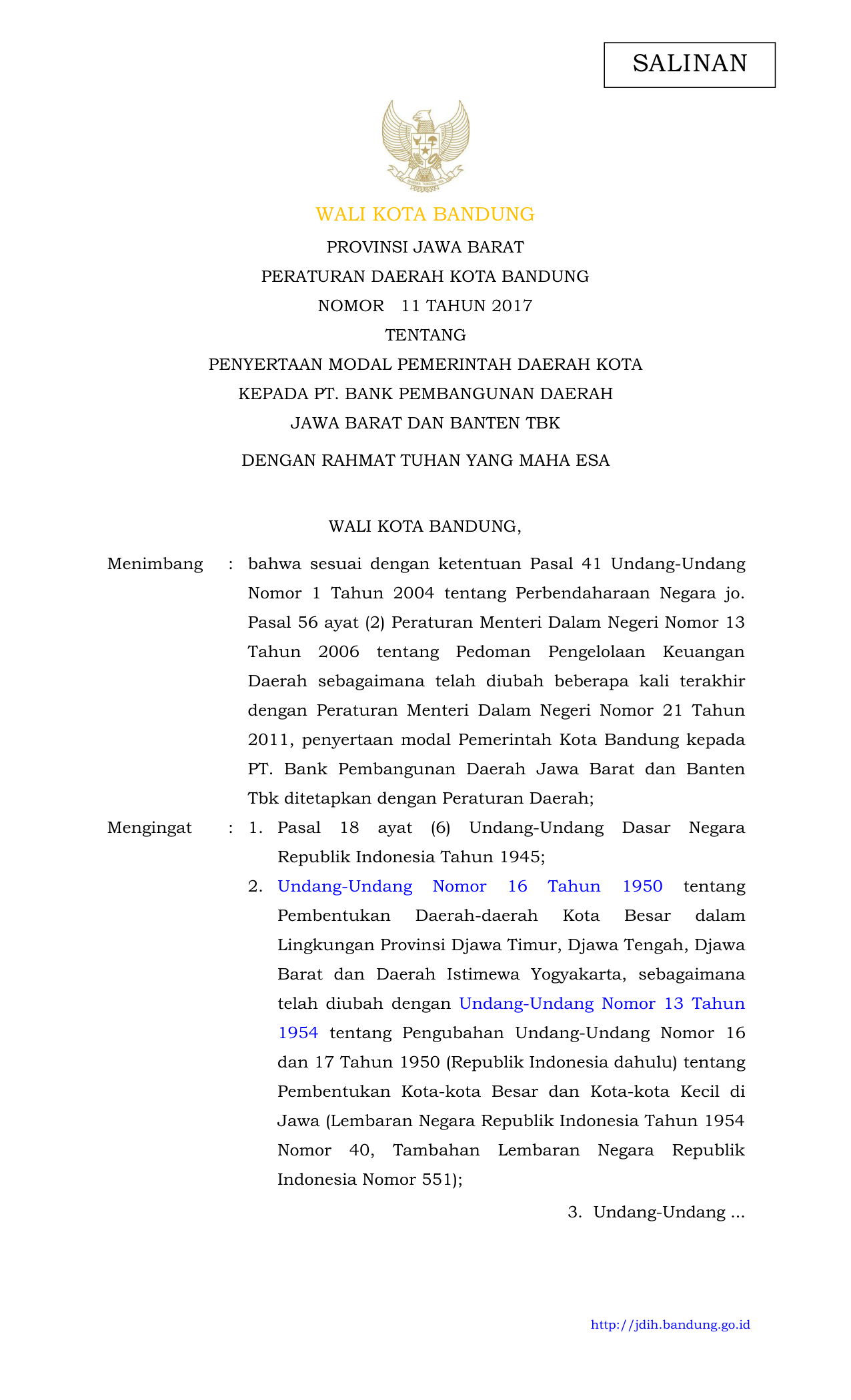 PERDA Nomor 11 Tahun 2017 | Peraturan Daerah Nomor 11 Tahun 2017 tentang Peraturan Daerah Kota Bandung Nomor 11 Tahun 2017 Penyertaan Modal Pemerintah Daerah Kota Kepada Pt. Bank Pembangunan Daerah Jawa Barat Dan Banten Tbk