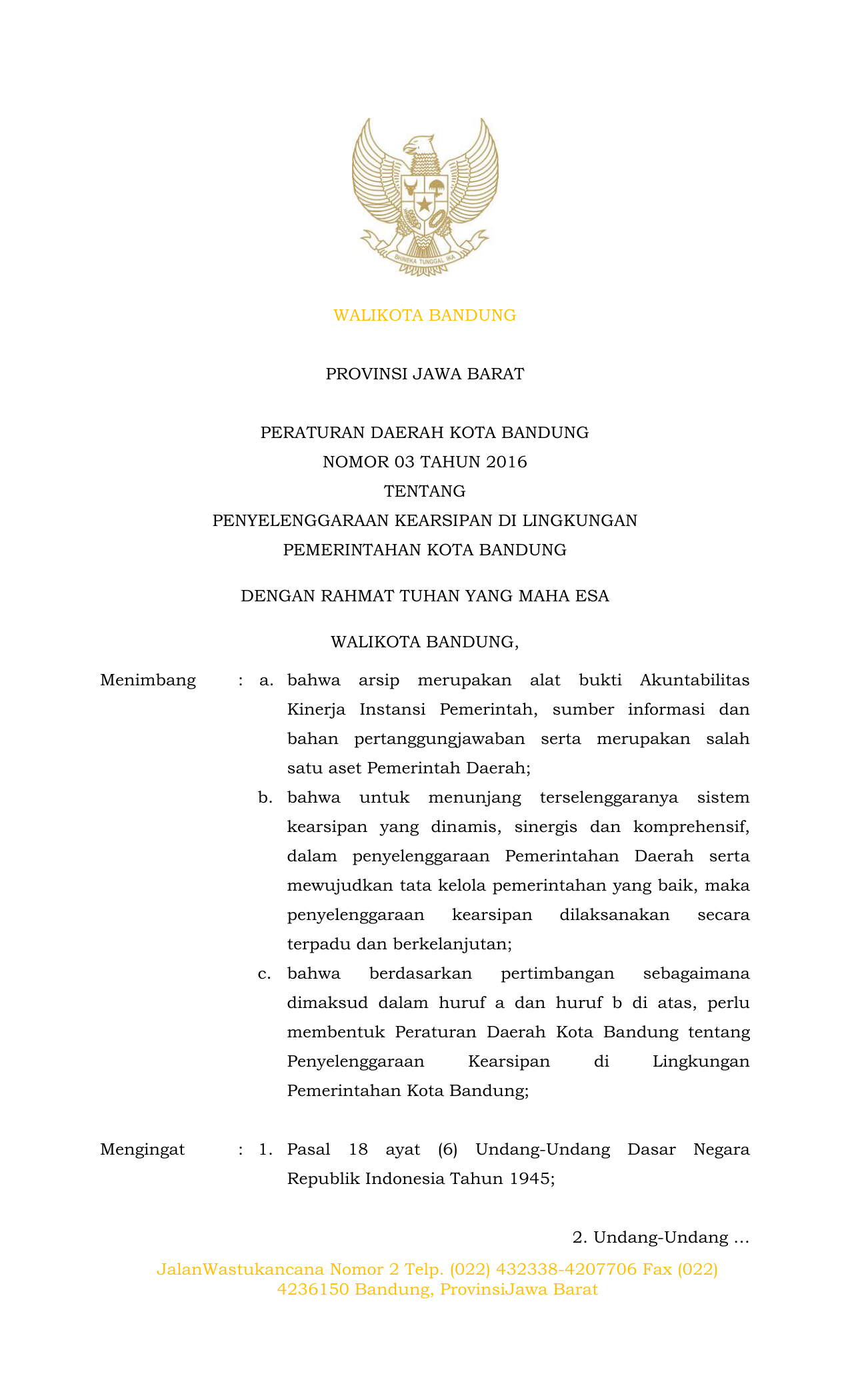 PERDA Nomor 3 Tahun 2016 | Peraturan Daerah Nomor 3 Tahun 2016 tentang Penyelenggaraan Kearsipan Di Lingkungan Pemerintahan Kota Bandung