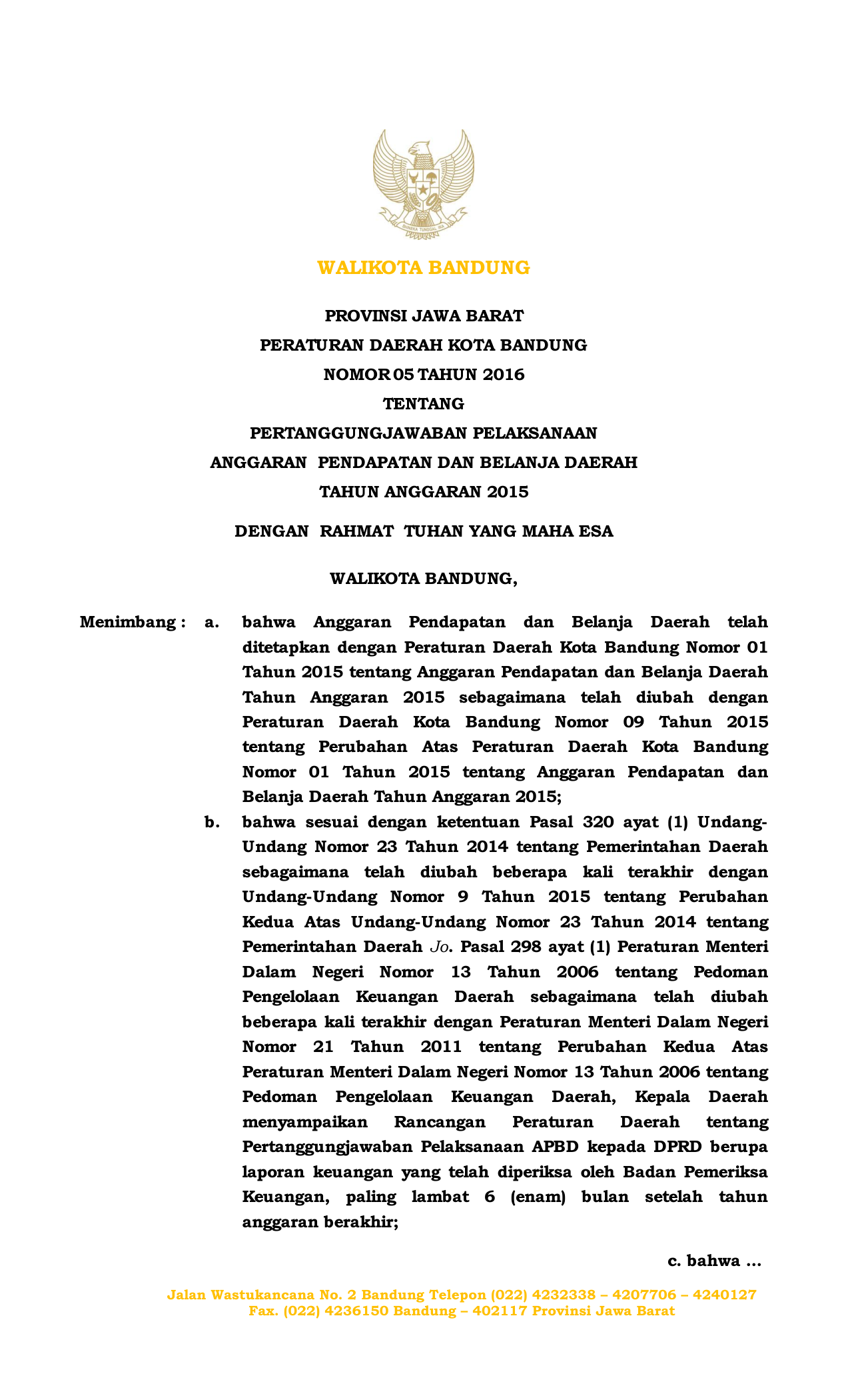 PERDA Nomor 5 Tahun 2016 | Peraturan Daerah Nomor 5 Tahun 2016 tentang Pertanggungjawaban Pelaksanaan Anggaran Pendapatan Dan Belanja Daerah Tahun Anggaran 2015