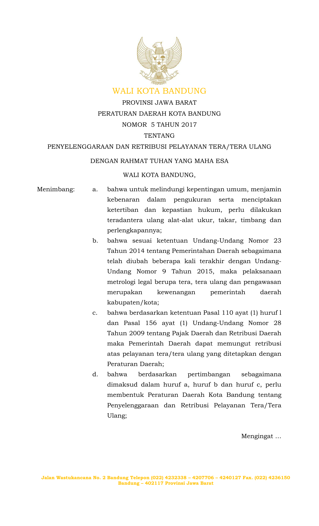 PERDA Nomor 5 Tahun 2017 | Peraturan Daerah Nomor 5 Tahun 2017 tentang Peraturan Daerah Kota Bandung Nomor 5 Tahun 2017 Penyelenggaraan Dan Retribusi Pelayanan Tera/tera Ulang