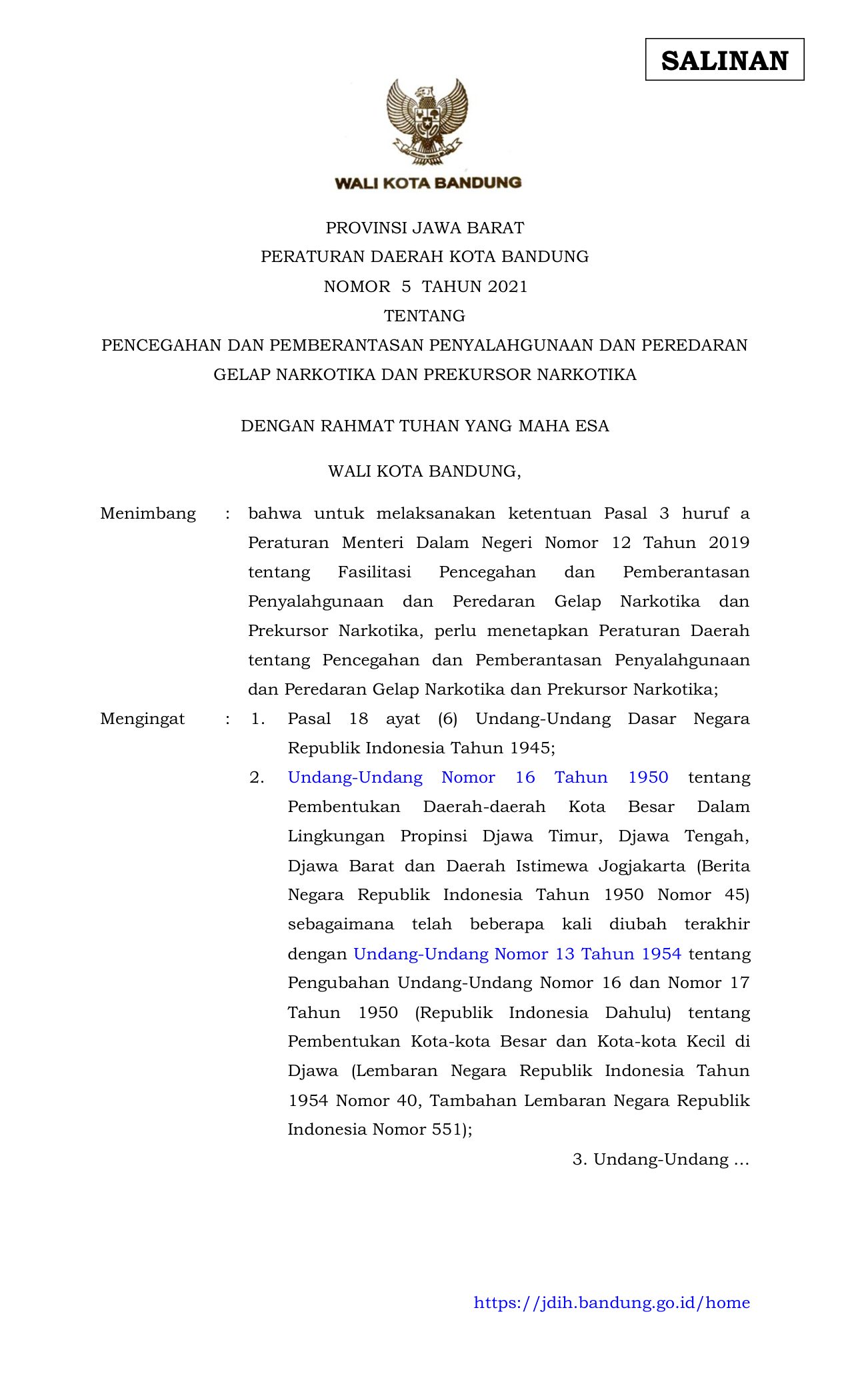 PERDA Nomor 5 Tahun 2021 | Peraturan Daerah Nomor 5 Tahun 2021 tentang Pencegahan Dan Pemberantasan Penyalahgunaan Dan Peredaran Gelap Narkotika Dan Prekursor Narkotika