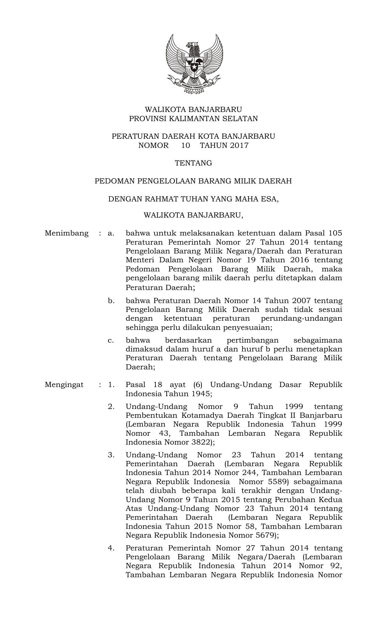PERDA Nomor 10 Tahun 2017 | Peraturan Daerah Nomor 10 Tahun 2017 tentang Pedoman Pengelolaan Barang Milik Daerah